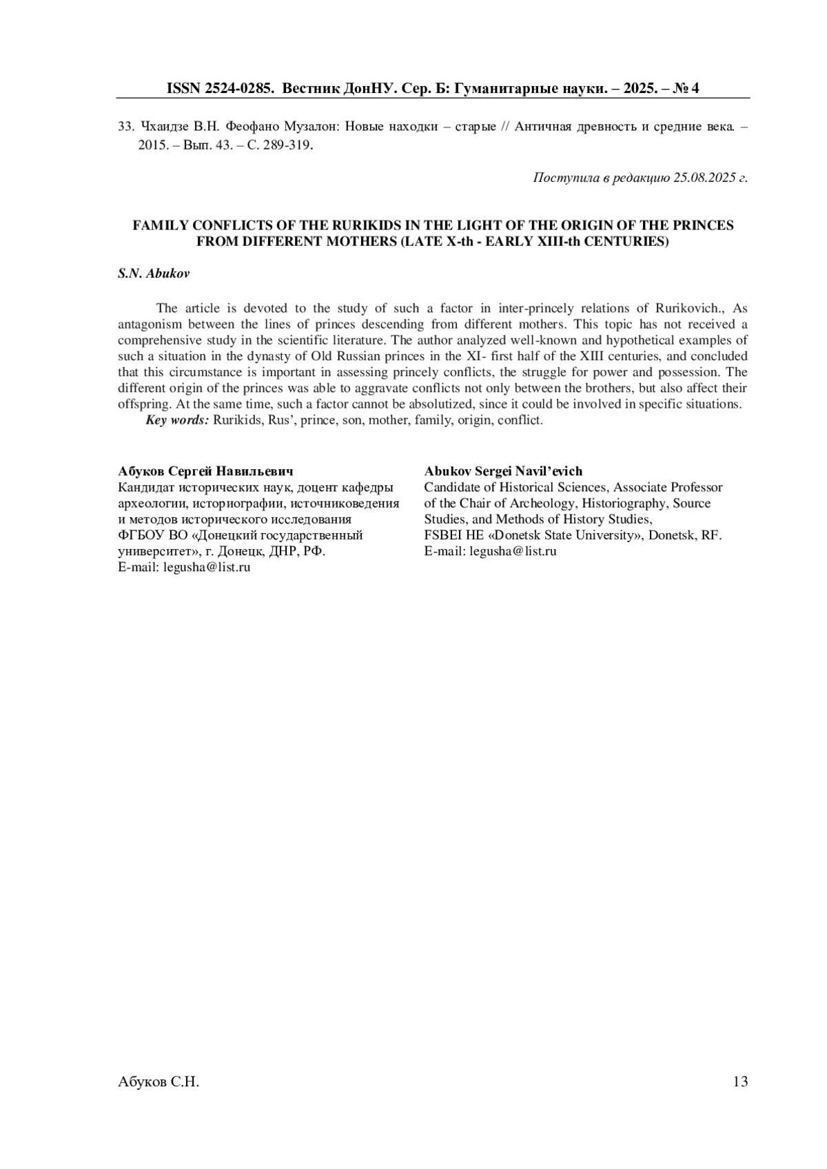 29. Абуков С.Н. К вопросу о происхождении первой жены Всеволода Ярославича // Вестник Донецкого национального университета. Серия Б. Гуманитарные науки. - 2024. - № 2. - С. 3-12.