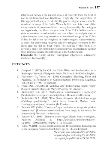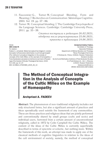 Феномен нетрадиционной религиозности включает в себя не только структурированные формы, но и значительный объем практик и идей, спорадически используемых вне рамок каких-либо сообществ. Практики и религиозные идеи, которые совместно исполняются и конвенционально разделяются малы ми группами (культы и секты) и отдельными пользователями, заимствуются из некого объема нетрадиционной религиозности, названного в 1972 году Колином Кэмпбэллом культовой средой общества. Содержательное наполнение идей культовой среды в настоящее время поверхностно описывается в терминах «синкретика» или «эклектика», но не более того. В рамках данной работы сделана попытка применить один из классических методов когнитивной лингвистики в отношении идей культовой среды общества, а именно - метод концептуальной интеграции между ментальными пространствами концептов из области неинституциализированной нетрадиционной религиозности. Применение данного подхода позволяет выявить процесс генезиса конкретного конструкта или образа культовой среды. В данном исследовании речь пойдет об одном из множества вариантов псевдомедицины, а именно - о гомеопатии. Согласно нашей гипотезе, идеи и практики культовой среды находятся в состоянии постоянной трансформации и подлежат анализу только в синхронном срезе. Любой конструкт или отдельный образ культовой среды по определению имеет религиозные или мифо-магические характеристики. Модель соединения религиозных и нерелигиозных элементов в изучаемой области до сих пор не была найдена. Цель данной работы - разработка модели соединения религиозных (мифо-магических) и светских (безрелигиозных) элементов в идеях культовой среды.