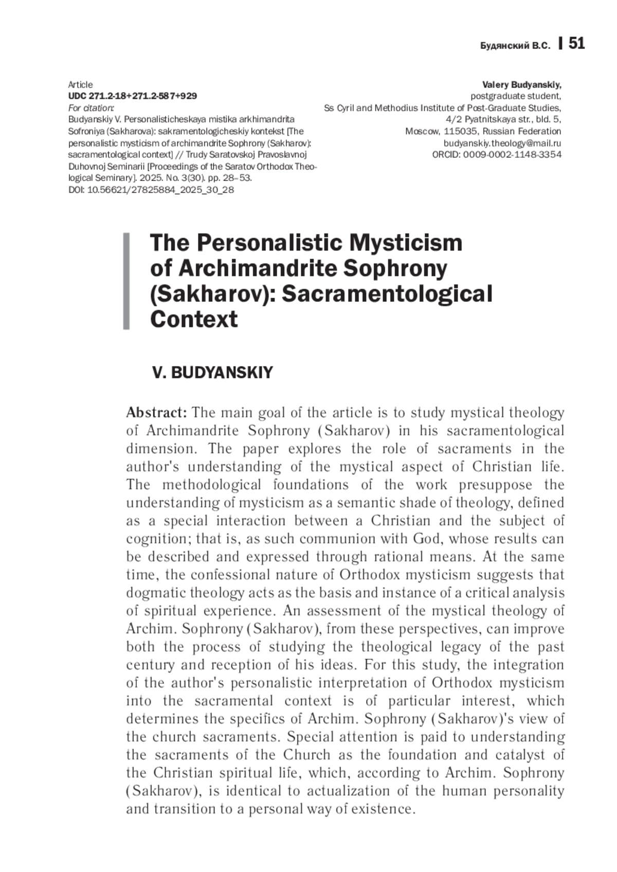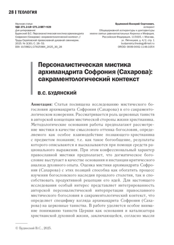 Статья посвящена исследованию мистического богословия архимандрита Софрония (Сахарова) в его сакраментологическом измерении. Рассматривается роль церковных таинств в авторской концепции мистической стороны жизни христианина. Методологические основания работы предполагают рассмотрение мистики в качестве смыслового оттенка богословия, определяемого как особое взаимодействие познающего-христианина с предметом познания; т. е. как такое богообщение, результаты которого описываются и высказываются при помощи средств рационального выражения. При этом конфессиональный характер православной мистики предполагает, что догматическое богословие выступает в качестве основания и инстанции критического анализа духовного опыта. Оценка мистики архимандрита Софрония (Сахарова) с этих позиций способна как обогатить процесс изучения богословского наследия прошлого столетия, так и способствовать продуктивной рецепции его идей. Для настоящего исследования особый интерес представляет интегрированность авторской персоналистической интерпретации православного мистического богословия в сакраментологический контекст, что определяет специфику взгляда архимандрита Софрония (Сахарова) на церковные таинства. В работе уделяется особое внимание пониманию таинств Церкви как основания и катализатора христианской духовной жизни, заключающейся, согласно мысли архимандрита Софрония (Сахарова), в актуализации человеческой личности и переходе к персональному способу существования.