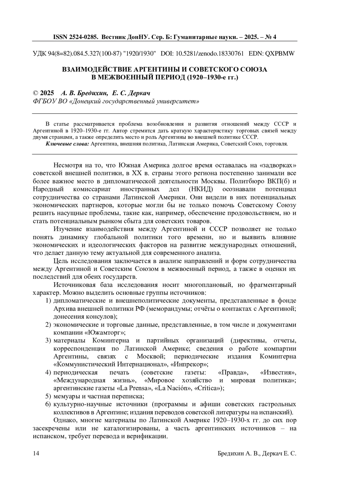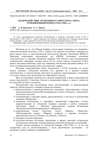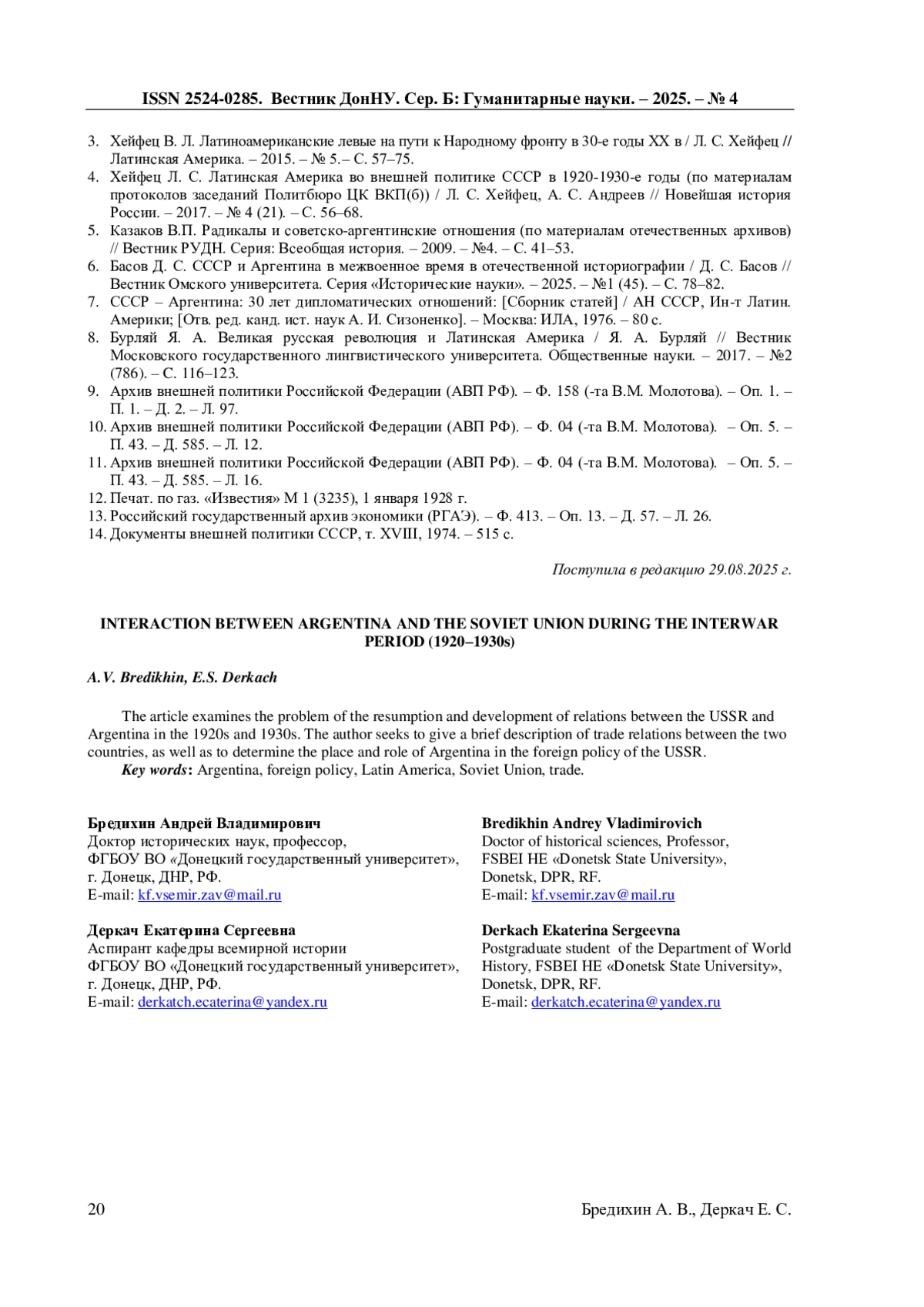 6. Басов Д. С. СССР и Аргентина в межвоенное время в отечественной историографии / Д. С. Басов // Вестник Омского университета. Серия “Исторические науки”. - 2025. - №1 (45). - С. 78-82.