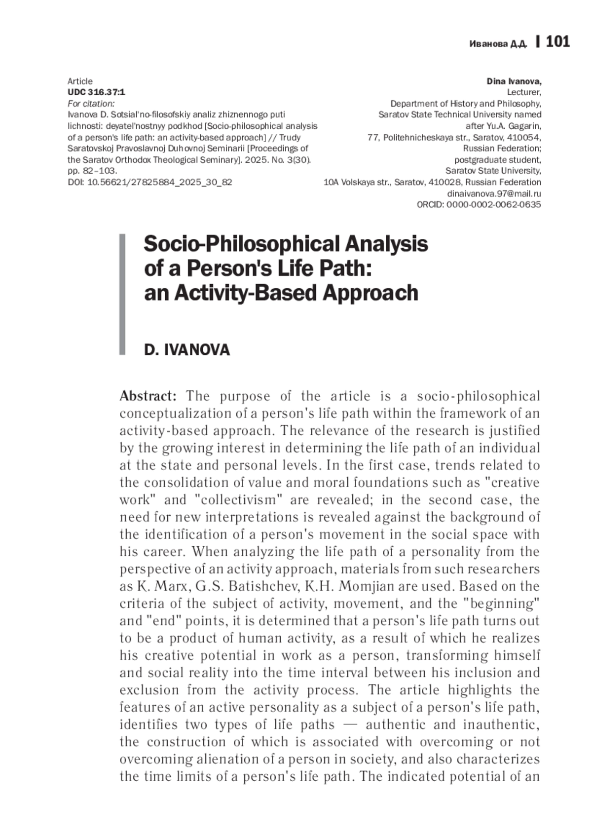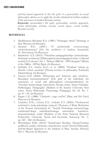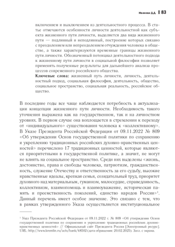 Целью статьи является социально-философский анализ жизненного пути личности в рамках деятельностного подхода. Актуальность исследования обосновывается ростом интереса к определению жизненного пути личности на государственном и личностном уровнях. В первом случае выявляются тенденции, связанные с закреплением ценностно-нравственных оснований, таких как «созидательный труд», «коллективизм», во втором - потребность в новых интерпретациях на фоне отождествления движения человека в социальном пространстве с его карьерой. При анализе жизненного пути личности с позиции деятельностного подхода используются материалы таких исследователей, как К. Маркс, Г. С. Батищев, К. Х. Момджян. На основании критериев субъекта деятельности, движения, точек «начало» и «конец» определяется, что жизненный путь личности оказывается продуктом деятельности человека, в результате создания которого он реализует свой творческий потенциал в труде как личности, преобразуя себя и социальную реальность во временной промежуток между его включением и выключением из деятельностного процесса. В статье отмечаются особенности личности деятельностной как субъекта жизненного пути личности, выделяется два вида жизненного пути - подлинный и неподлинный, построение которых связано с преодолением или непреодолением отчуждения человека в обществе, а также характеризуются временные границы жизненного пути личности. Обозначенный потенциал деятельностного подхода к жизненному пути личности в социальной философии позволяет применять полученные результаты для дальнейшего анализа процессов современного российского общества.