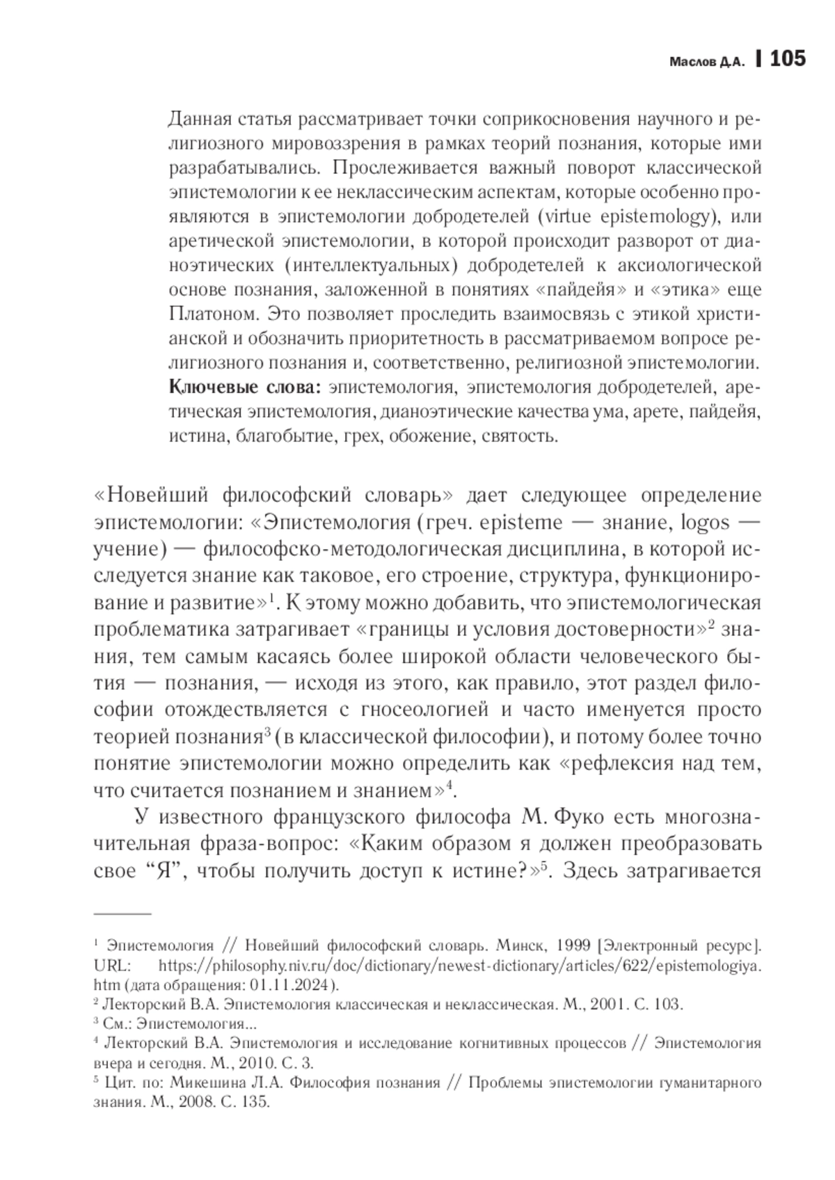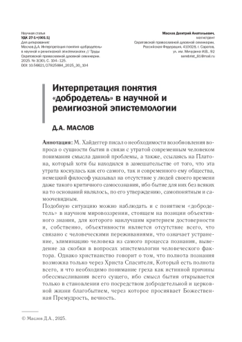 М. Хайдеггер писал о необходимости возобновления вопроса о сущности бытия в связи с утратой современным человеком понимания смысла данной проблемы, а также, ссылаясь на Платона, который хотя бы находился в замешательстве от того, что эта утрата коснулась как его самого, так и современного ему общества, немецкий философ указывал на отсутствие у людей своего времени даже такого критичного самосознания, ибо бытие для них без всяких на то оснований являлось, по его утверждению, самопонятным и самоочевидным. Подобную ситуацию можно наблюдать и с понятием «добродетель» в научном мировоззрении, стоящем на позиции объективного знания, для которого наилучшим критерием достоверности и, собственно, объективности является отсутствие всего, что связано с человеческими переживаниями, что означает устранение, элиминацию человека из самого процесса познания, выведение за скобки в вопросах эпистемологии человеческого фактора. Однако христианство говорит о том, что полнота познания возможна только через Христа Спасителя, Который есть полнота всего, и что необходимо понимание греха как истинной причины обессмысливания всего сущего, ибо смысл бытия открывается только в становлении его посредством добродетельной и церковной жизни благобытием, через которое просиявает Божественная Премудрость, вечность. Данная статья рассматривает точки соприкосновения научного и религиозного мировоззрения в рамках теорий познания, которые ими разрабатывались. Прослеживается важный поворот классической эпистемологии к ее неклассическим аспектам, которые особенно проявляются в эпистемологии добродетелей (virtue epistemology), или аретической эпистемологии, в которой происходит разворот от дианоэтических (интеллектуальных) добродетелей к аксиологической основе познания, заложенной в понятиях «пайдейя» и «этика» еще Платоном. Это позволяет проследить взаимосвязь с этикой христианской и обозначить приоритетность в рассматриваемом вопросе религиозного познания и, соответственно, религиозной эпистемологии.