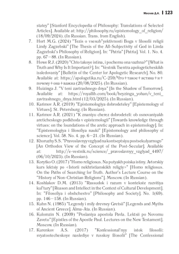 39. Хоу Р.Дж. Что такое истина, и почему она важна? // Вестник Центра апологетических исследований. 2020. № 80 [Электронный ресурс]. URL: https://apologetika.ru/C-259/Что+такое+истина+и+почему+она+важна (дата обращения 20.08.2025). Яз. рус.