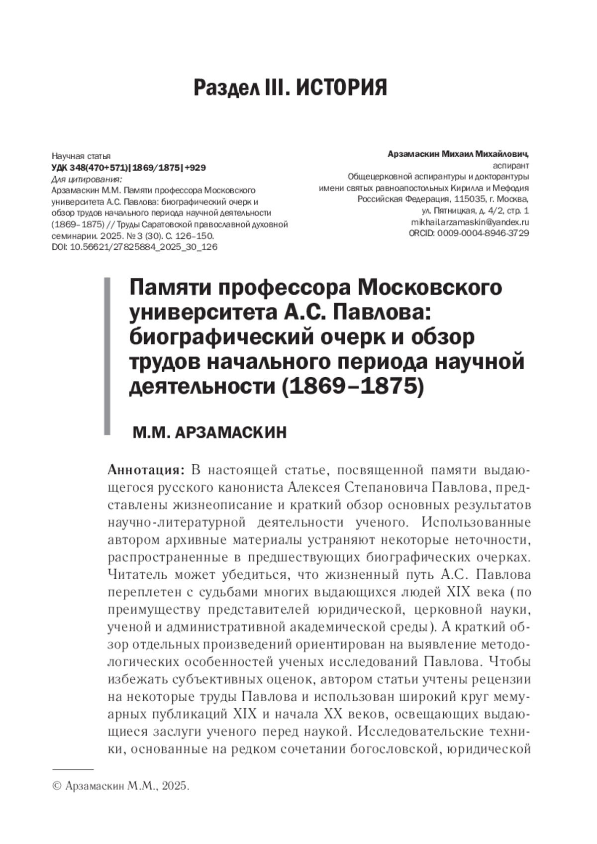 В настоящей статье, посвященной памяти выдающегося русского канониста Алексея Степановича Павлова, представлены жизнеописание и краткий обзор основных результатов научно-литературной деятельности ученого. Использованные автором архивные материалы устраняют некоторые неточности, распространенные в предшествующих биографических очерках. Читатель может убедиться, что жизненный путь А. С. Павлова переплетен с судьбами многих выдающихся людей XIX века (по преимуществу представителей юридической, церковной науки, ученой и административной академической среды). А краткий обзор отдельных произведений ориентирован на выявление методологических особенностей ученых исследований Павлова. Чтобы избежать субъективных оценок, автором статьи учтены рецензии на некоторые труды Павлова и использован широкий круг мемуарных публикаций XIX и начала XX веков, освещающих выдающиеся заслуги ученого перед наукой. Исследовательские техники, основанные на редком сочетании богословской, юридической и широкой филологической подготовленности историка права и церковного правоведа, позволили профессору Павлову выработать собственный сравнительно-критико-библиографический метод исследований и оставить после себя феноменальную монографическую разработку отдельных вопросов по церковному праву. Соединение таких исследовательских качеств может способствовать достижению некогда поставленной Павловым задачи создать систему русского церковного права.