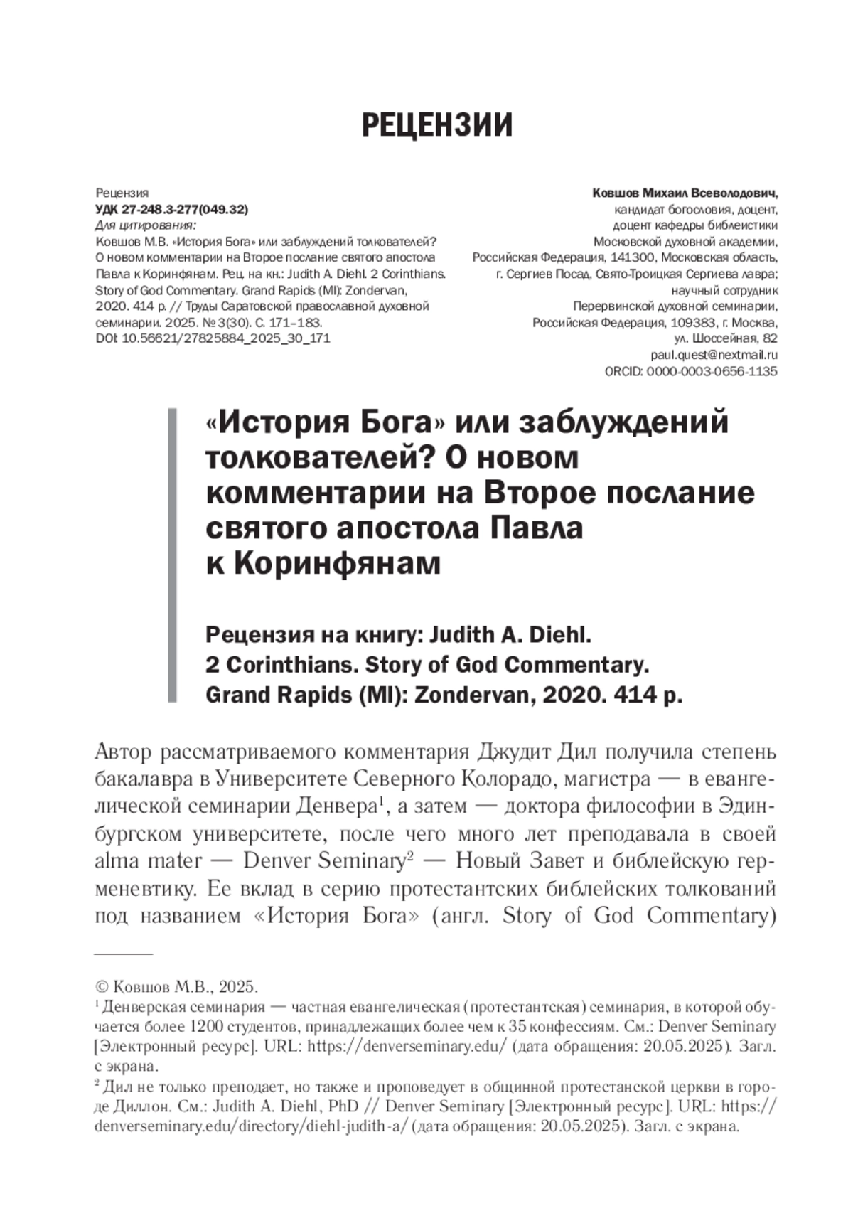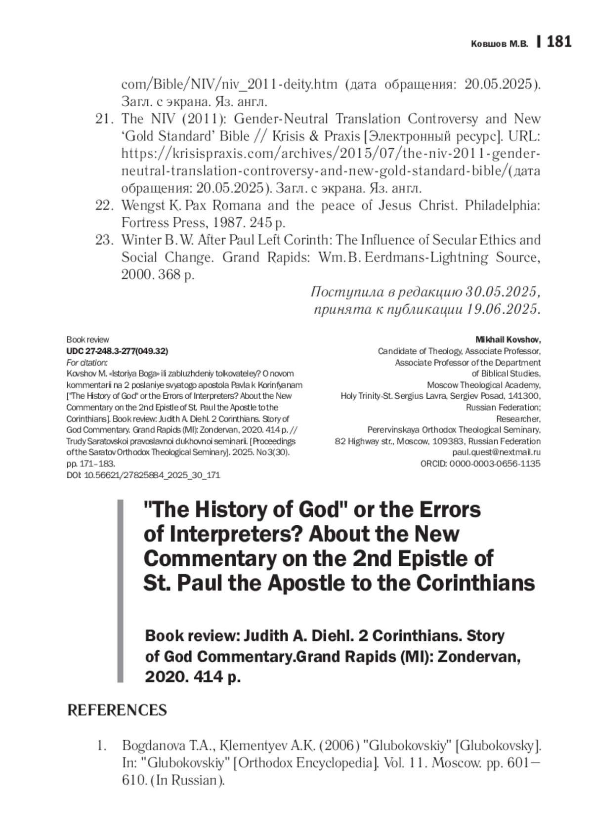 6. Ковшов М.В. Ветхий Завет и апостол язычников: Писание, тексты и аллюзии в Первом послании святого апостола Павла к Коринфянам. Рец. на кн.: Scripture, Texts, and Tracings in 1 Corinthians (Scripture and Paul) / Edited by Linda Belleville and B. J. Oropeza. Lexington: Fortress Academic, 2019. 296 p. // Труды Саратовской православной духовной семинарии. 2024. № 1(24). С. 152-159. EDN: QSXACW