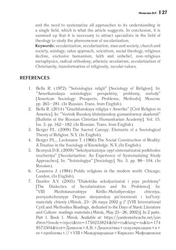 1. Безнюк Д.К. Секуляризация: опыт систематизации подходов изучения // Социология. 2009. № 3. С. 98-104.
