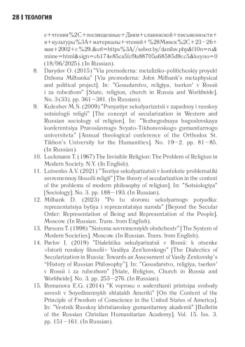 6. Кулешев М.С. Понятие секуляризации в западной и русской социологии религии // Ежегодная богословская конференция Православного Свято-Тихоновского гуманитарного университета. 2009. № 19-2. С. 81-85. EDN: UYUZMD