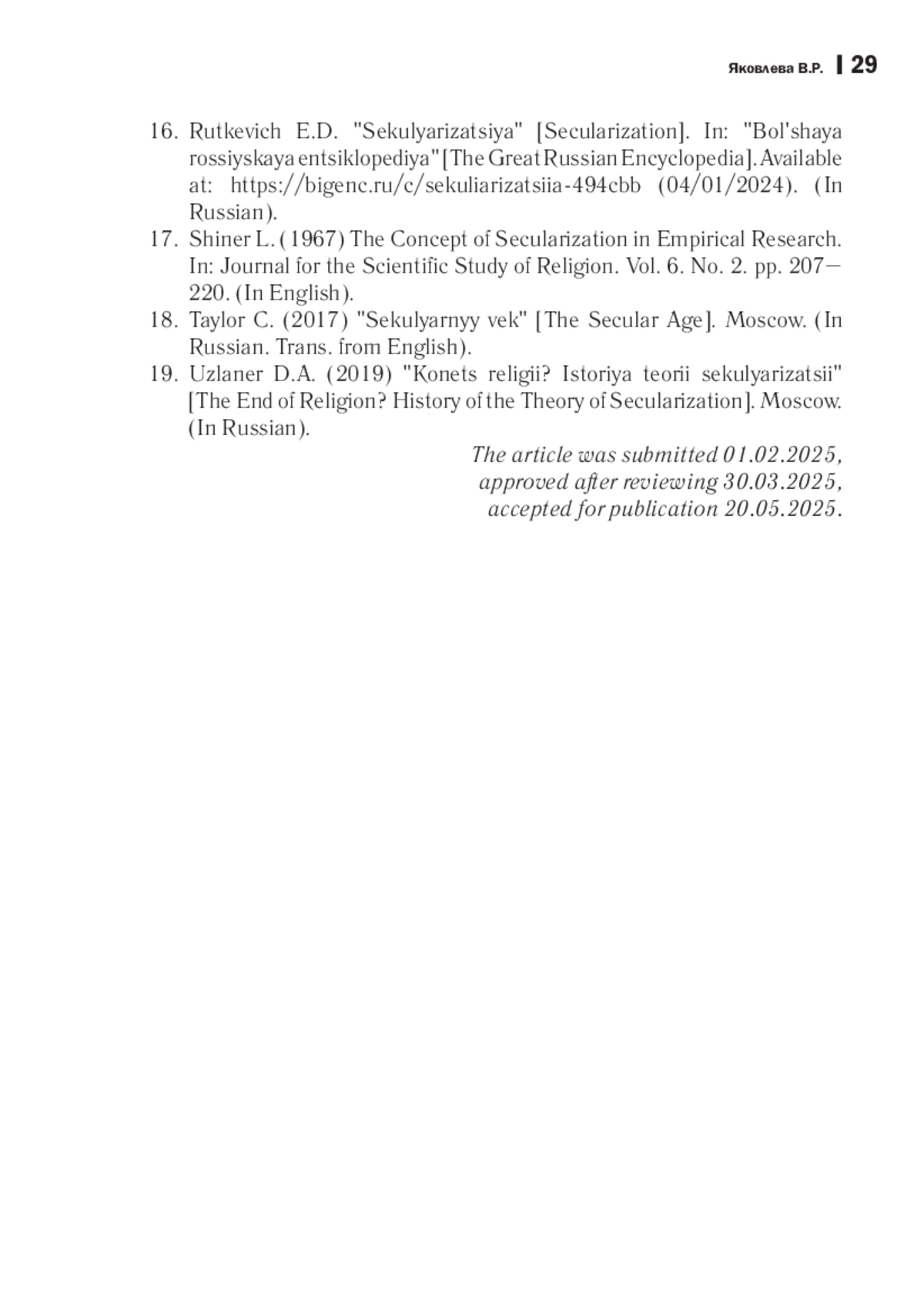 20. Shiner L. The Concept of Secularization in Empirical Research // Journal for the Scientific Study of Religion. 1967. Vol. 6. No. 2. pp. 207-220.