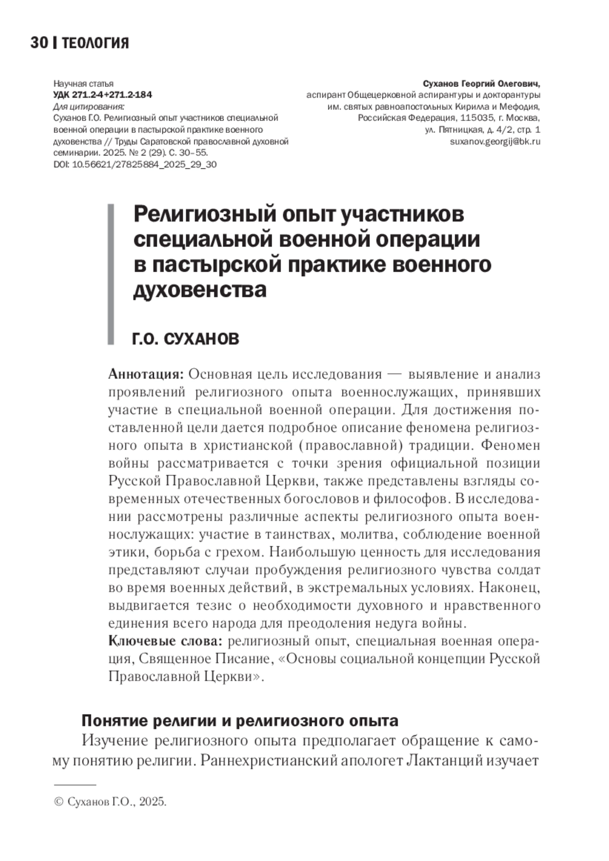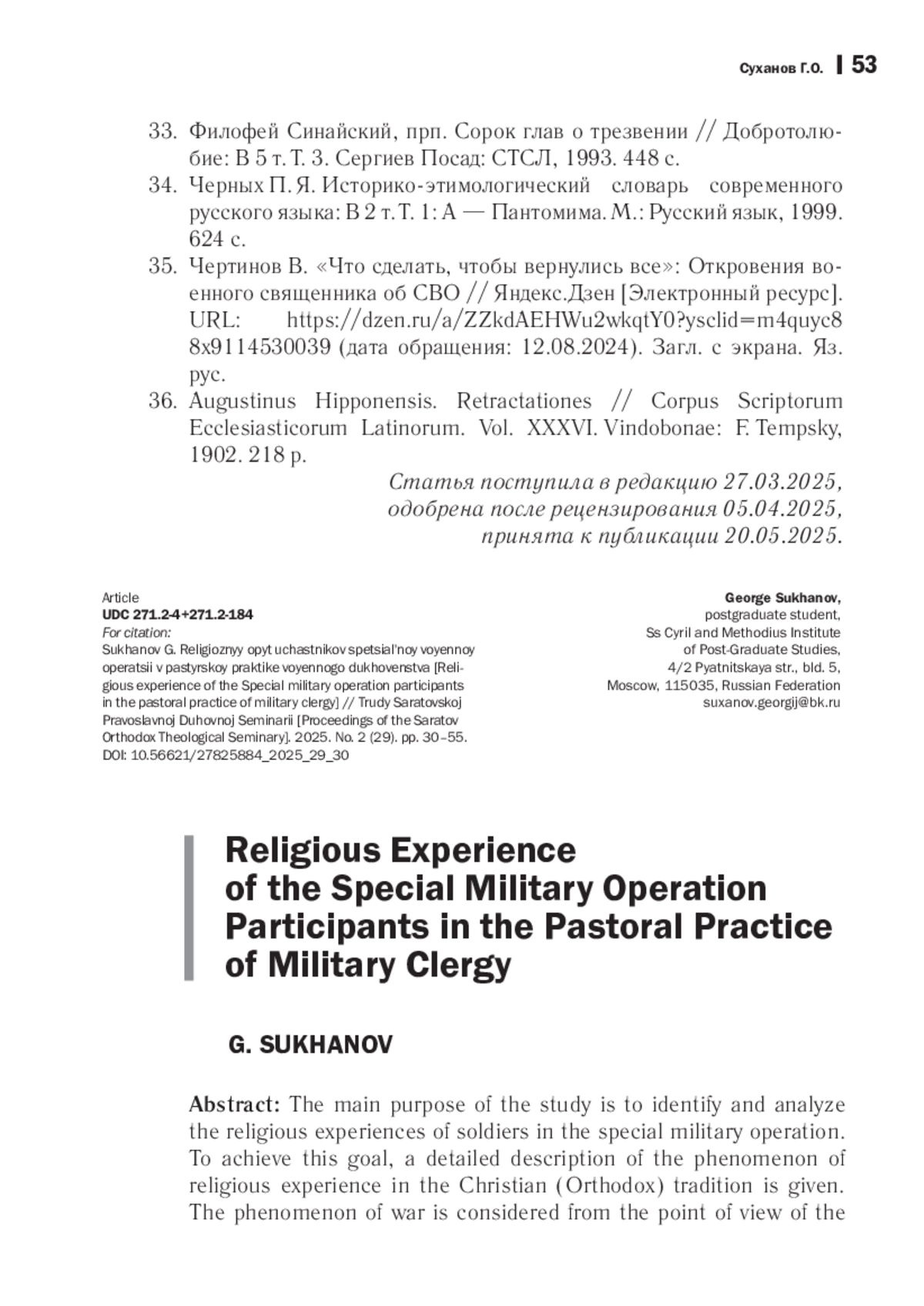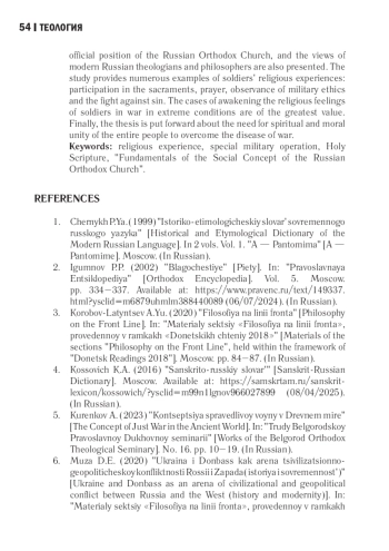 30. Суханов Г.О. Православное осмысление войны на основе Священного Писания и святоотеческого наследия // Богословский вестник. 2024. № 3 (54). С. 340-370. EDN: TEUZES
