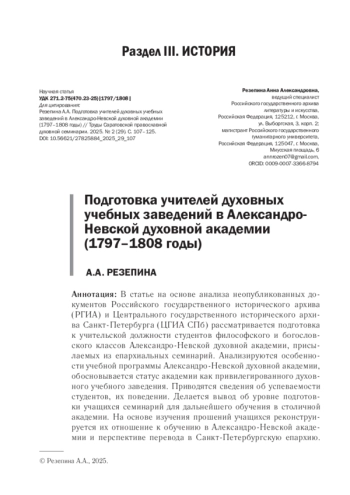 25. Резепина А.А. Александро-Невская академия: быт, образование, воспитание (1796-1801 гг.) // Ноябрьские чтения - 2023: сборник статей по итогам XV Всероссийской конференции студентов, аспирантов и молодых ученых. СПб.: Скифия-принт, 2024. С. 284-289. EDN: TUWZEO