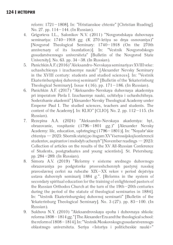 26. Симора А.В. Реформы в системе среднего духовного образования по подготовке просвещенных пастырей Русской Православной Церкви на рубеже XIX-XX веков в период действия Устава духовных семинарий 1884 г. // Вестник Екатеринбургской духовной семинарии. 2019. № 3 (27). С. 83-100. EDN: MDIOEM