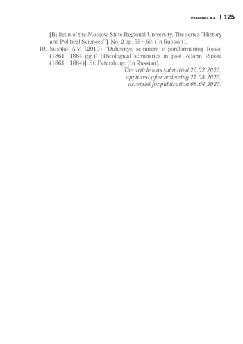 29. Сушко А.В. Духовные семинарии в пореформенной России (1861-1884 гг.). СПб.: Издательство СПбГМА им. И. И. Мечникова, 2010. 256 с. EDN: QVBIDP