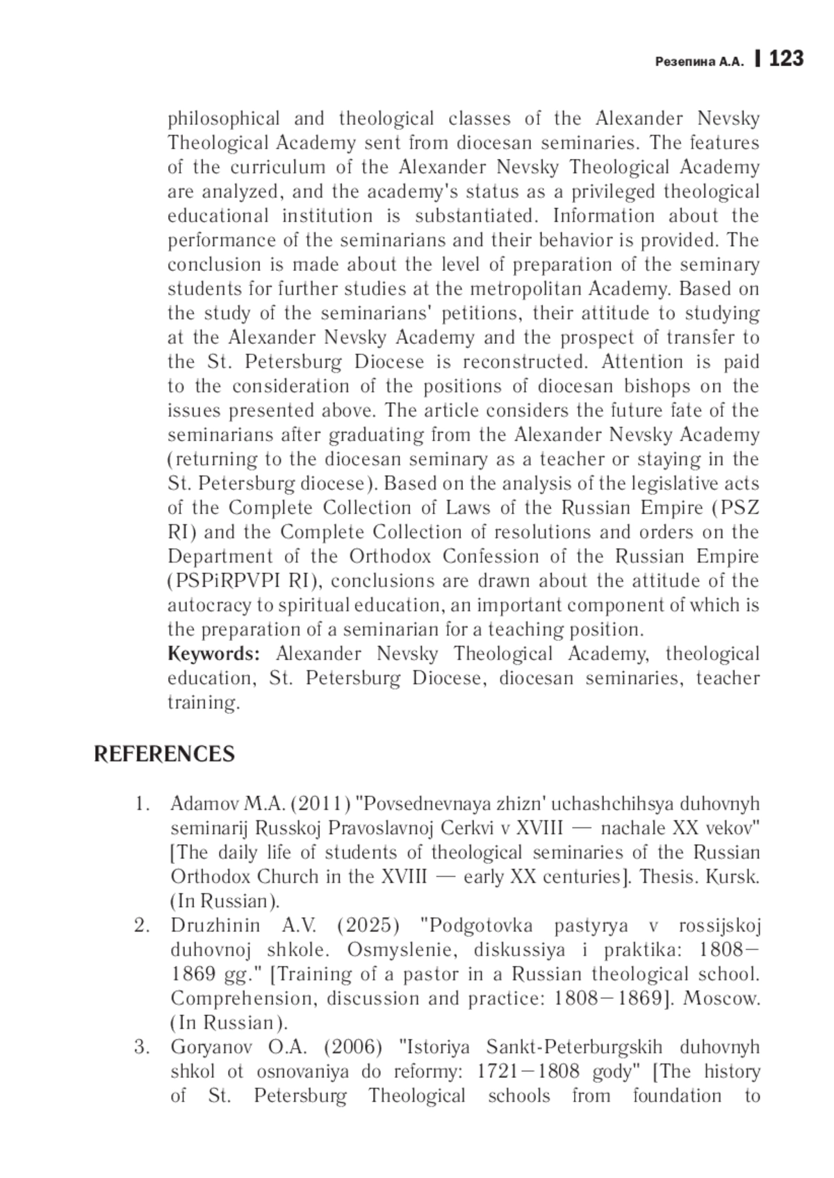 1. Адамов М. А. Повседневная жизнь учащихся духовных семинарий Русской Православной Церкви в XVIII - начале XX веков: дис. … канд. ист. наук: 07.00.02. Курск, 2011. 355 с. EDN: QFGJOJ