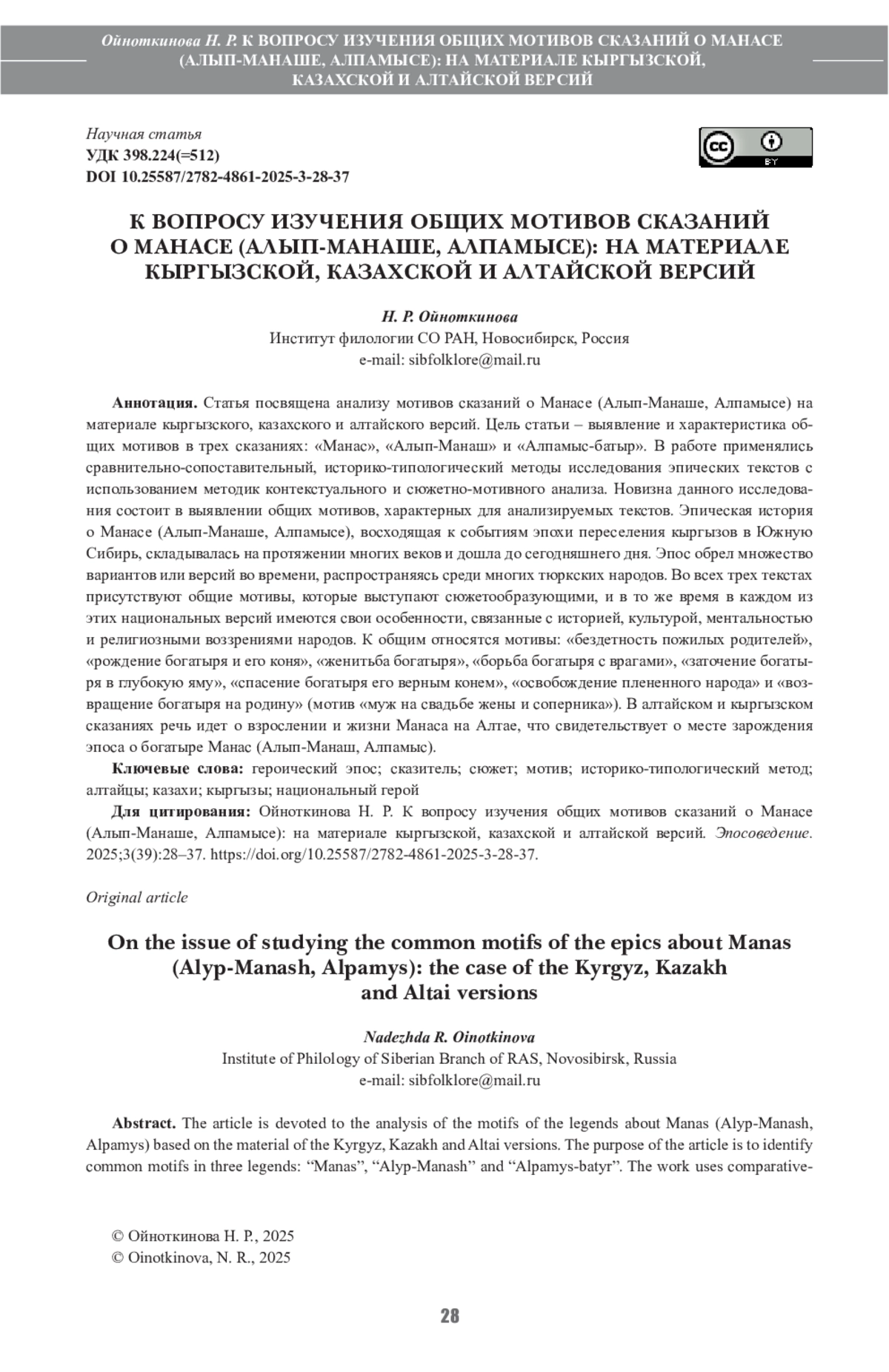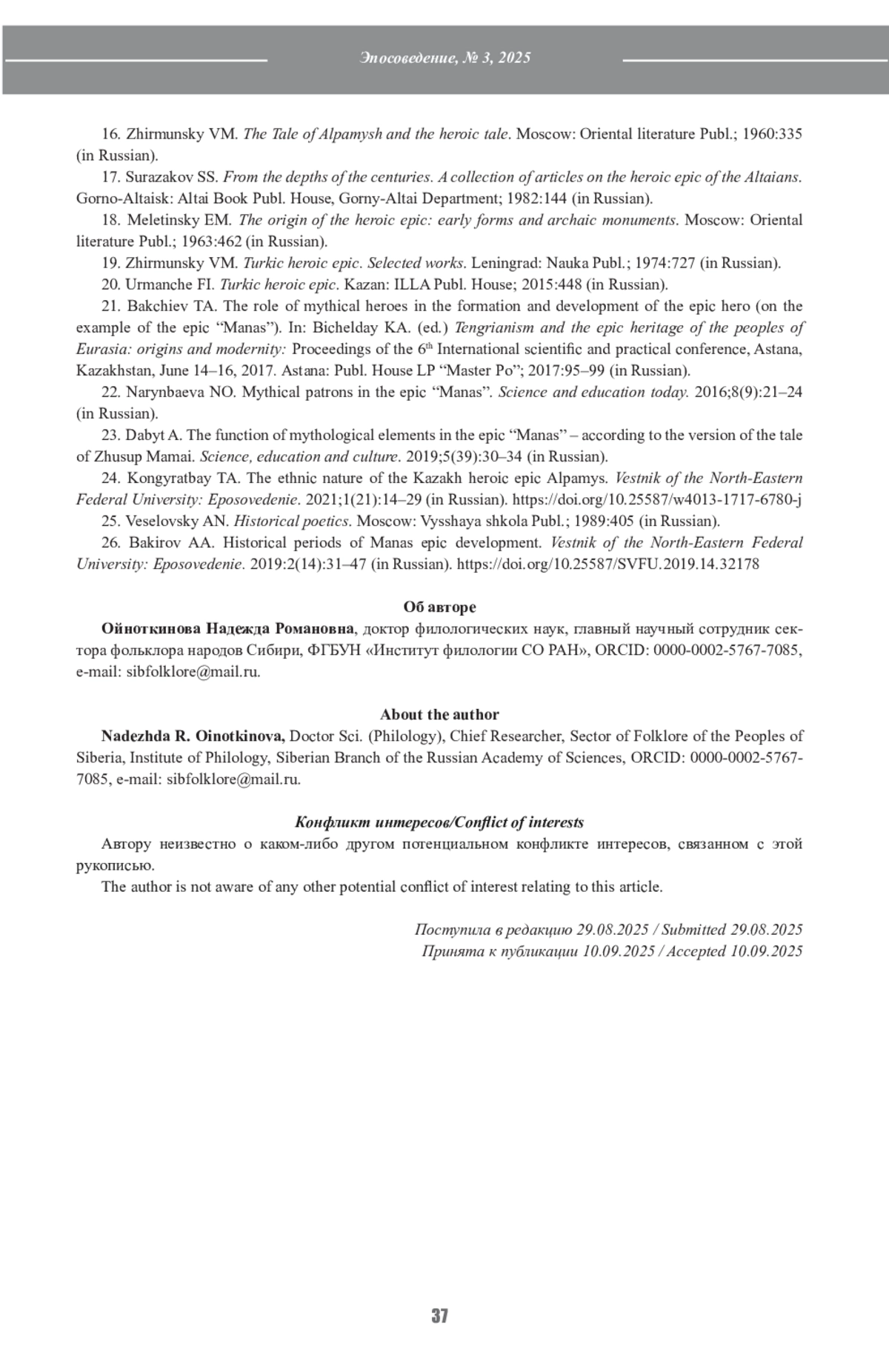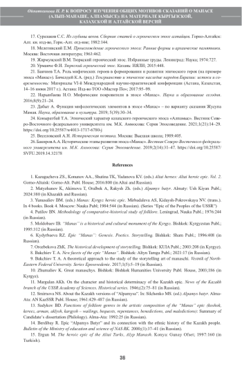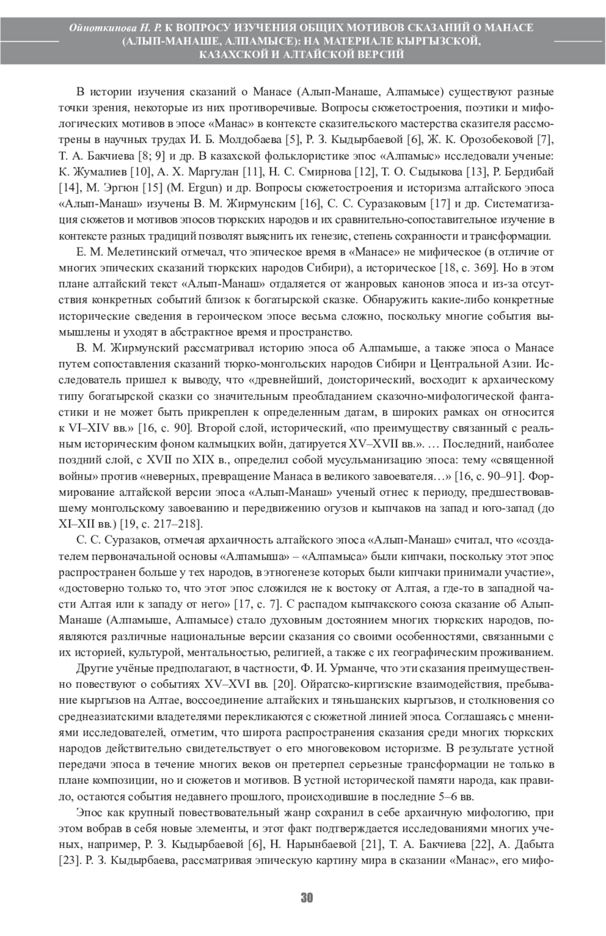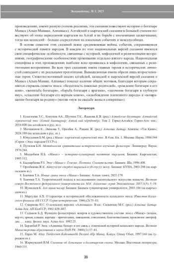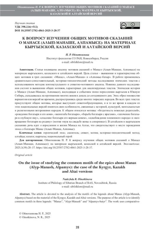 Статья посвящена анализу мотивов сказаний о Манасе (Алып-Манаше, Алпамысе) на материале кыргызского, казахского и алтайского версий. Цель статьи – выявление и характеристика общих мотивов в трех сказаниях: «Манас», «Алып-Манаш» и «Алпамыс-батыр». В работе применялись сравнительно-сопоставительный, историко-типологический методы исследования эпических текстов с использованием методик контекстуального и сюжетно-мотивного анализа. Новизна данного исследования состоит в выявлении общих мотивов, характерных для анализируемых текстов. Эпическая история о Манасе (Алып-Манаше, Алпамысе), восходящая к событиям эпохи переселения кыргызов в Южную Сибирь, складывалась на протяжении многих веков и дошла до сегодняшнего дня. Эпос обрел множество вариантов или версий во времени, распространяясь среди многих тюркских народов. Во всех трех текстах присутствуют общие мотивы, которые выступают сюжетообразующими, и в то же время в каждом из этих национальных версий имеются свои особенности, связанные с историей, культурой, ментальностью и религиозными воззрениями народов. К общим относятся мотивы: «бездетность пожилых родителей», «рождение богатыря и его коня», «женитьба богатыря», «борьба богатыря с врагами», «заточение богатыря в глубокую яму», «спасение богатыря его верным конем», «освобождение плененного народа» и «возвращение богатыря на родину» (мотив «муж на свадьбе жены и соперника»). В алтайском и кыргызском сказаниях речь идет о взрослении и жизни Манаса на Алтае, что свидетельствует о месте зарождения эпоса о богатыре Манас (Алып-Манаш, Алпамыс).