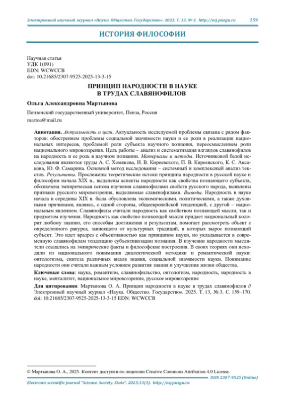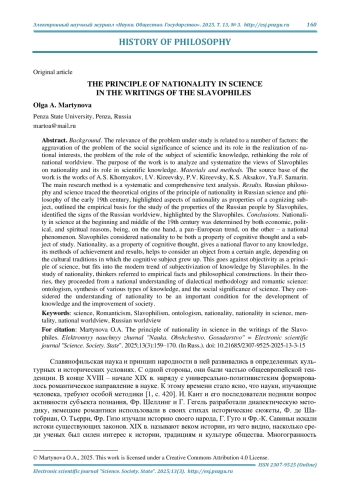 Результаты. Прослежены теоретические истоки принципа народности в русской науке и философии начала XIX в., выделены аспекты народности как свойства познающего субъекта, обозначена эмпирическая основа изучения славянофилами свойств русского народа, выявлены признаки русского мировоззрения, выделяемые славянофилами.