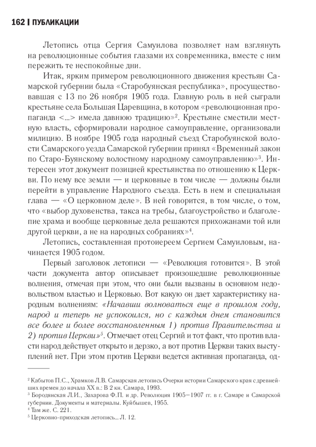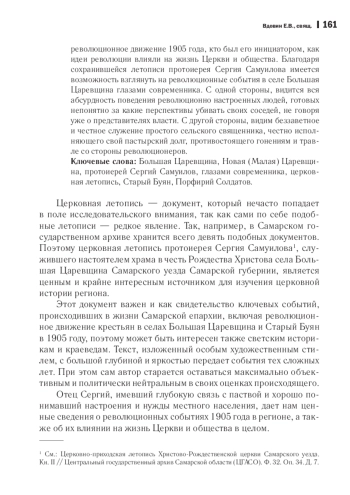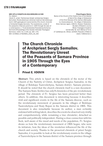 В основу настоящей статьи легла летопись настоятеля храма в честь Рождества Христова села Большая Царевщина Самарского уезда Самарской губернии протоиерея Сергия Самуилова. Следует заметить, что церковная летопись сама по себе документ редкий. В Самарском государственном архиве имеется всего девять летописей дореволюционного периода. Летопись отца Сергия сохранилась лучше других. Кроме этого данный документ интересен тем, что описывает яркие и значимые события в жизни Самарской епархии, такие как революционное движение крестьян сел Большая Царевщина и Старый Буян Самарского уезда в 1905 году. Замечателен данный документ еще и тем, что его автор - человек, безусловно, наделенный писательским талантом,- очень ярко и всесторонне описывает наблюдаемые им события, оставаясь при этом настоящим летописцем, отстраненным, насколько это возможно, и политически независимым. Имея тесную связь со своей паствой, хорошо зная настроения и потребности населения, отец Сергий показывает нам, как начиналось революционное движение 1905 года, кто был его инициатором, как идеи революции влияли на жизнь Церкви и общества. Благодаря сохранившейся летописи протоиерея Сергия Самуилова имеется возможность взглянуть на революционные события в селе Большая Царевщина глазами современника. С одной стороны, видится вся абсурдность поведения революционно настроенных людей, готовых непонятно за какие перспективы убивать своих соседей, не говоря уже о представителях власти. С другой стороны, видим беззаветное и честное служение простого сельского священника, честно исполняющего свой пастырский долг, противостоящего гонениям и травле со стороны революционеров.