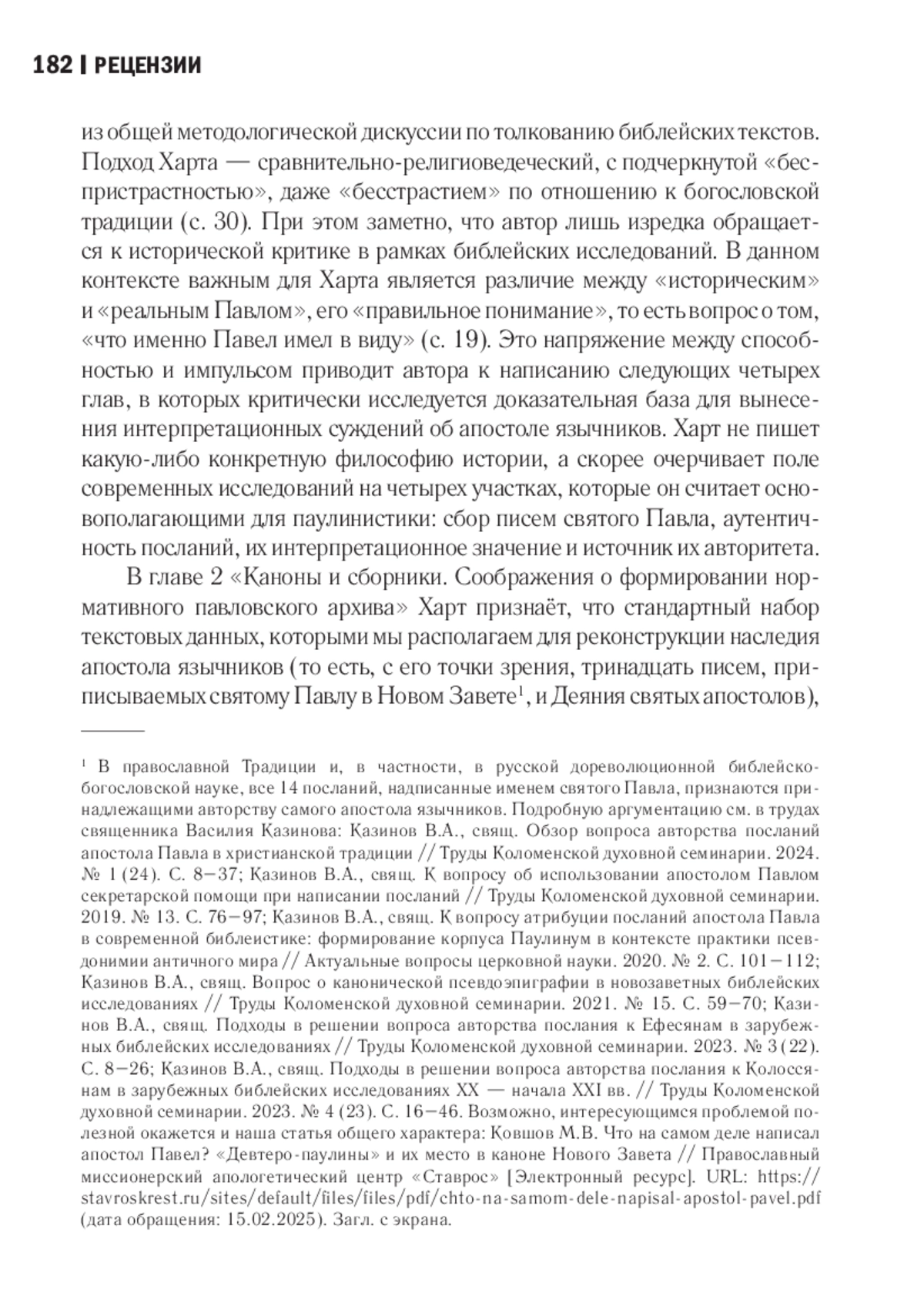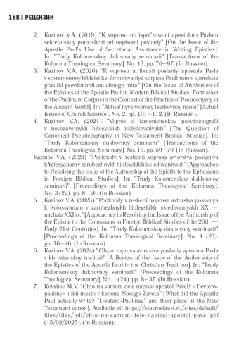 5. Казинов В. А., свящ. Обзор вопроса авторства посланий апостола Павла в христианской традиции // Труды Коломенской духовной семинарии. 2024. № 1 (24). С. 8-37. EDN: KSMYUS