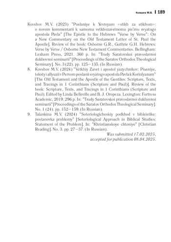 8. Ковшов М. В. Ветхий Завет и апостол язычников: Писание, тексты и аллюзии в Первом послании святого апостола Павла к Коринфянам. Рец. на кн.: Scripture, Texts, and Tracings in 1 Corinthians (Scripture and Paul) / Edited by Linda Belleville and B. J. Oropeza. Lexington: Fortress Academic, 2019. 296 p. // Труды Саратовской православной духовной семинарии. 2024. № 1 (24). С. 152-159. EDN: QSXACW
