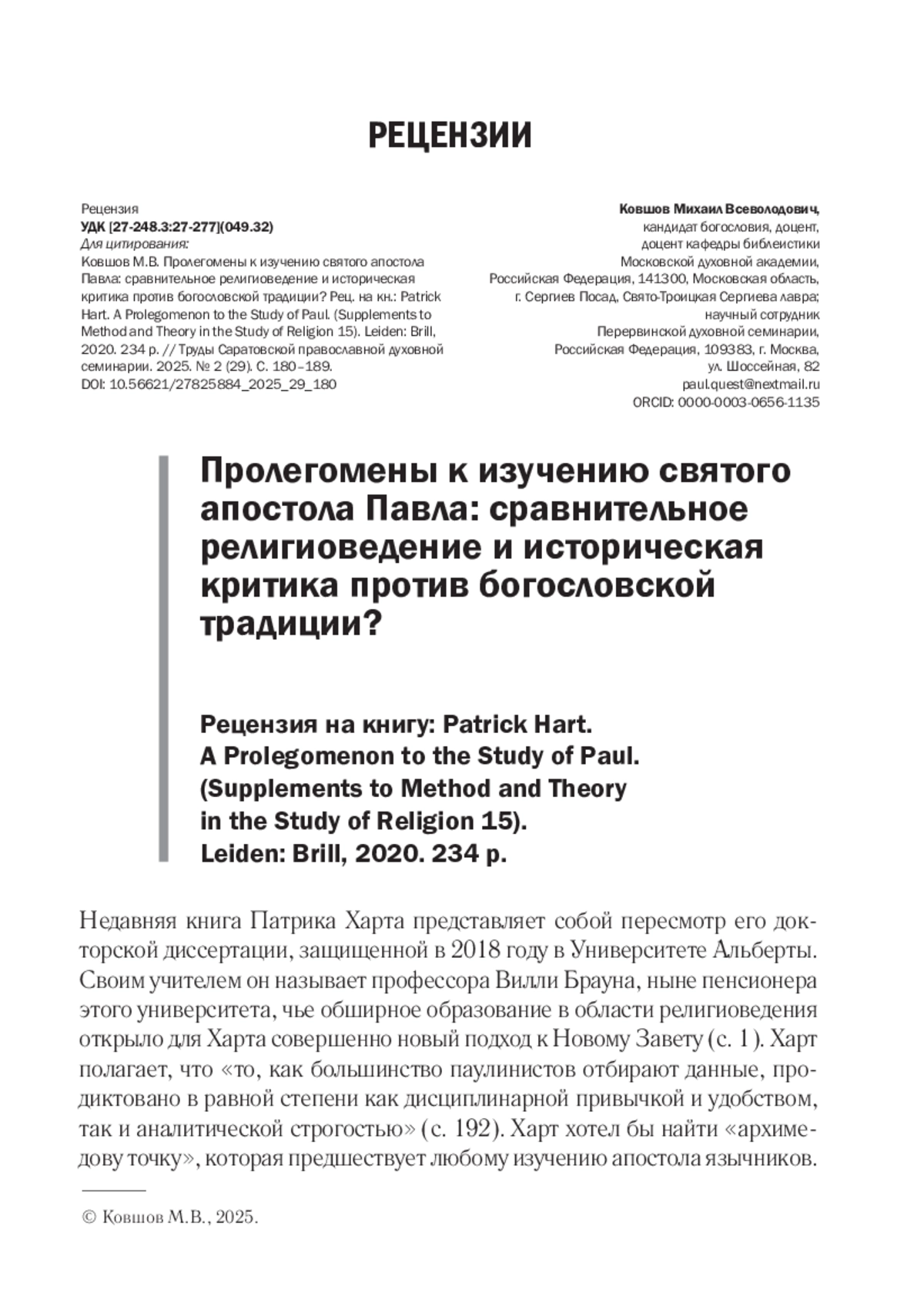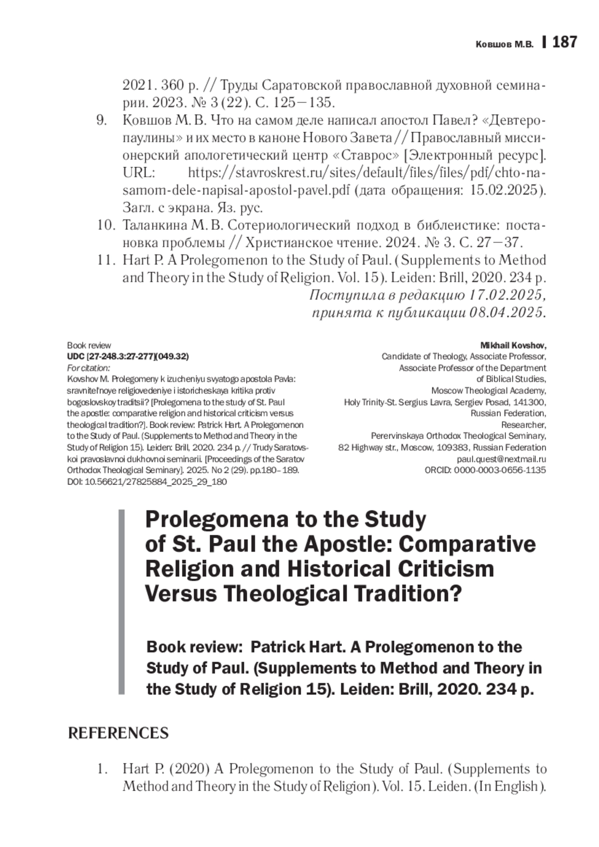 12. Hart P. A Prolegomenon to the Study of Paul. (Supplements to Method and Theory in the Study of Religion. Vol. 15). Leiden: Brill, 2020. 234 p.