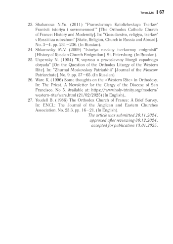 11. Шабанова Н. Ю. Православная Католическая Церковь Франции: история и современность // Государство, религия, церковь в России и за рубежом. 2011. № 3-4. С. 231-236. EDN: PFQLHZ