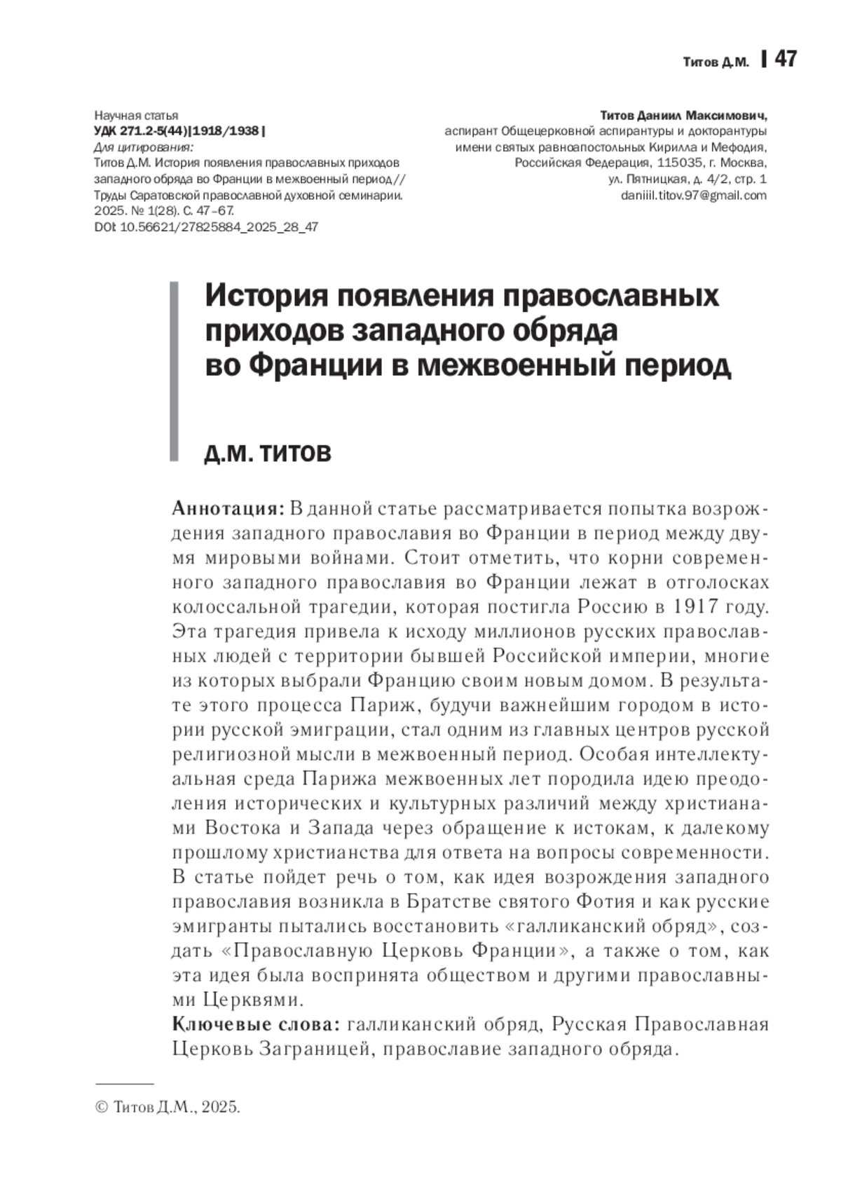 В данной статье рассматривается попытка возрождения западного православия во Франции в период между двумя мировыми войнами. Стоит отметить, что корни современного западного православия во Франции лежат в отголосках колоссальной трагедии, которая постигла Россию в 1917 году. Эта трагедия привела к исходу миллионов русских православных людей с территории бывшей Российской империи, многие из которых выбрали Францию своим новым домом. В результате этого процесса Париж, будучи важнейшим городом в истории русской эмиграции, стал одним из главных центров русской религиозной мысли в межвоенный период. Особая интеллектуальная среда Парижа межвоенных лет породила идею преодоления исторических и культурных различий между христианами Востока и Запада через обращение к истокам, к далекому прошлому христианства для ответа на вопросы современности. В статье пойдет речь о том, как идея возрождения западного православия возникла в Братстве святого Фотия и как русские эмигранты пытались восстановить «галликанский обряд», создать «Православную Церковь Франции», а также о том, как эта идея была воспринята обществом и другими православными Церквями.