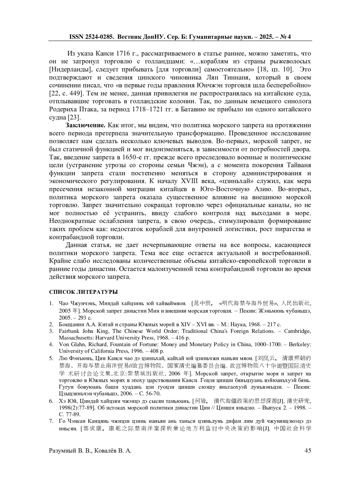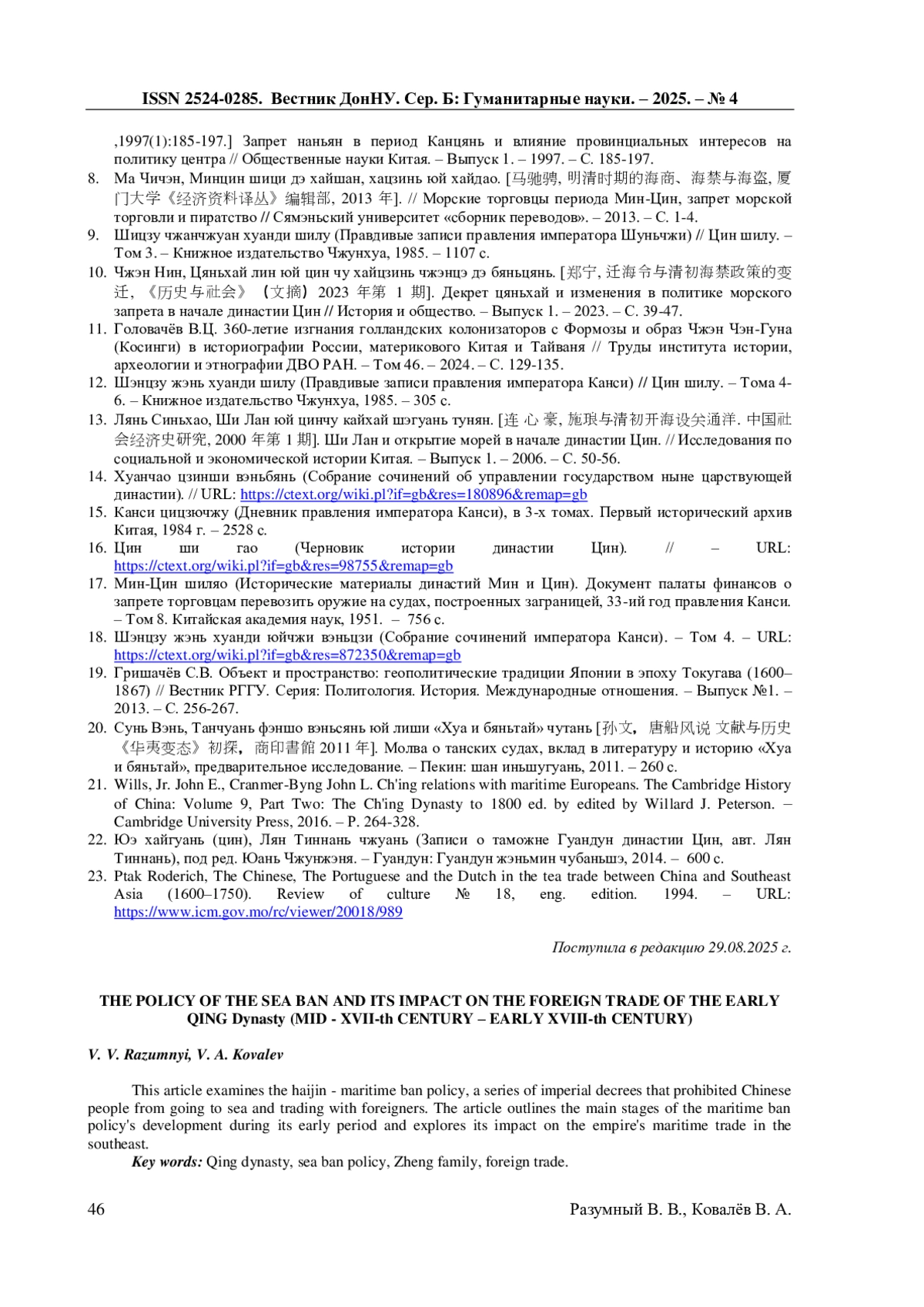 10. Чжэн Нин, Цяньхай лин юй цин чу хайцзинь чжэнцэ дэ бяньцянь. [郑宁, 迁海令与清初海禁政策的变 迁, 《历史与社会》 文摘 2023 年第 1 期]. Декрет цяньхай и изменения в политике морского запрета в начале династии Цин // История и общество. - Выпуск 1. - 2023. - С. 39-47.
