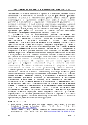 1. Viader Guerrero J. Beyond the Digital Public Sphere: Towards a Political Ontology of Algorithmic Technologies // Philosophy & Technology. - 2024. - Vol. 37. - № 1. - P. 3-22. -. DOI: 10.1007/s13347-024-00789-x