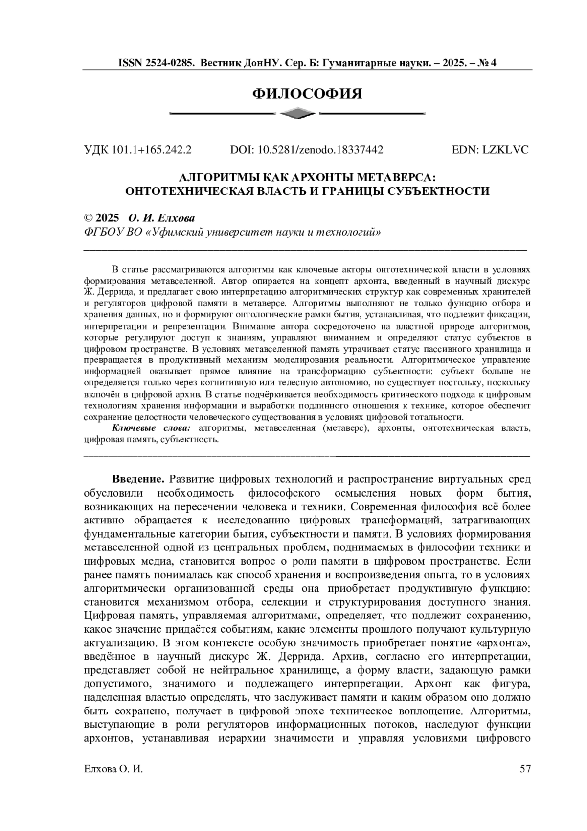 В статье рассматриваются алгоритмы как ключевые акторы онтотехнической власти в условиях формирования метавселенной. Автор опирается на концепт архонта, введенный в научный дискурс Ж. Деррида, и предлагает свою интерпретацию алгоритмических структур как современных хранителей и регуляторов цифровой памяти в метаверсе. Алгоритмы выполняют не только функцию отбора и хранения данных, но и формируют онтологические рамки бытия, устанавливая, что подлежит фиксации, интерпретации и репрезентации. Внимание автора сосредоточено на властной природе алгоритмов, которые регулируют доступ к знаниям, управляют вниманием и определяют статус субъектов в цифровом пространстве. В условиях метавселенной память утрачивает статус пассивного хранилища и превращается в продуктивный механизм моделирования реальности. Алгоритмическое управление информацией оказывает прямое влияние на трансформацию субъектности: субъект больше не определяется только через когнитивную или телесную автономию, но существует постольку, поскольку включён в цифровой архив. В статье подчёркивается необходимость критического подхода к цифровым технологиям хранения информации и выработки подлинного отношения к технике, которое обеспечит сохранение целостности человеческого существования в условиях цифровой тотальности.