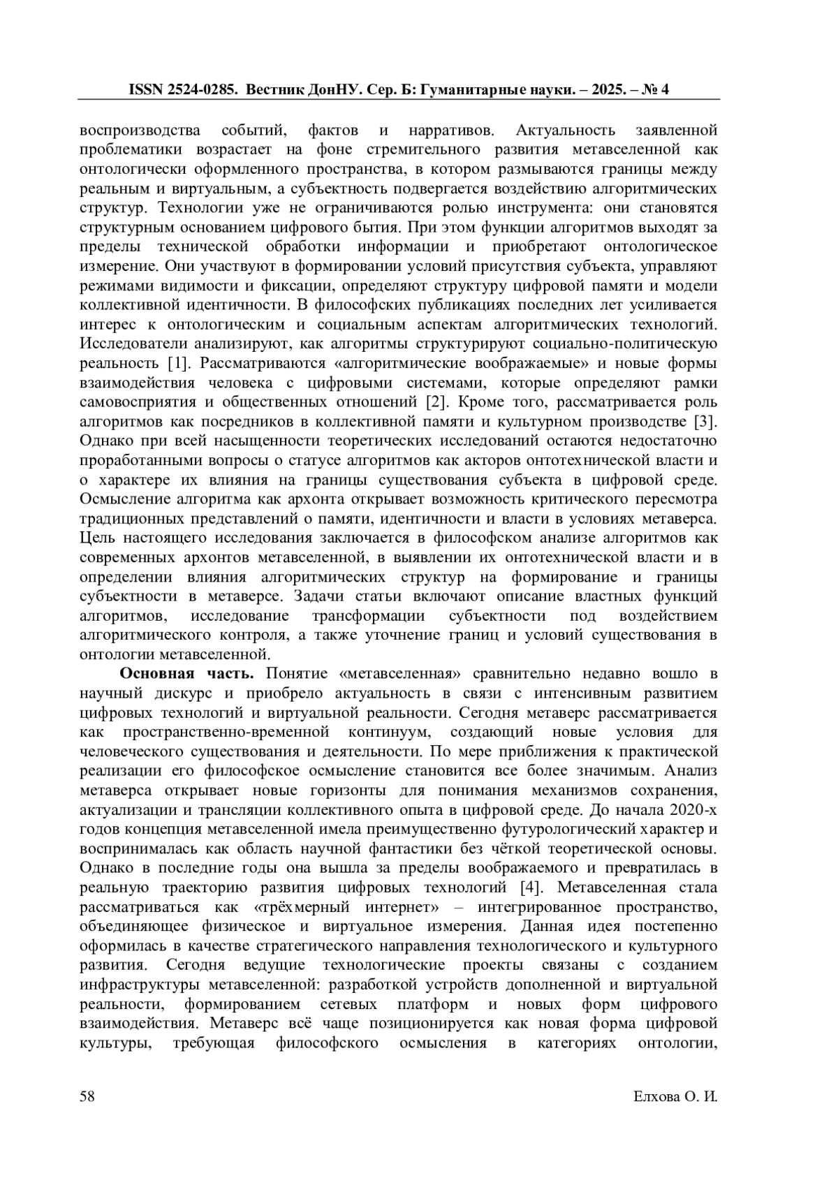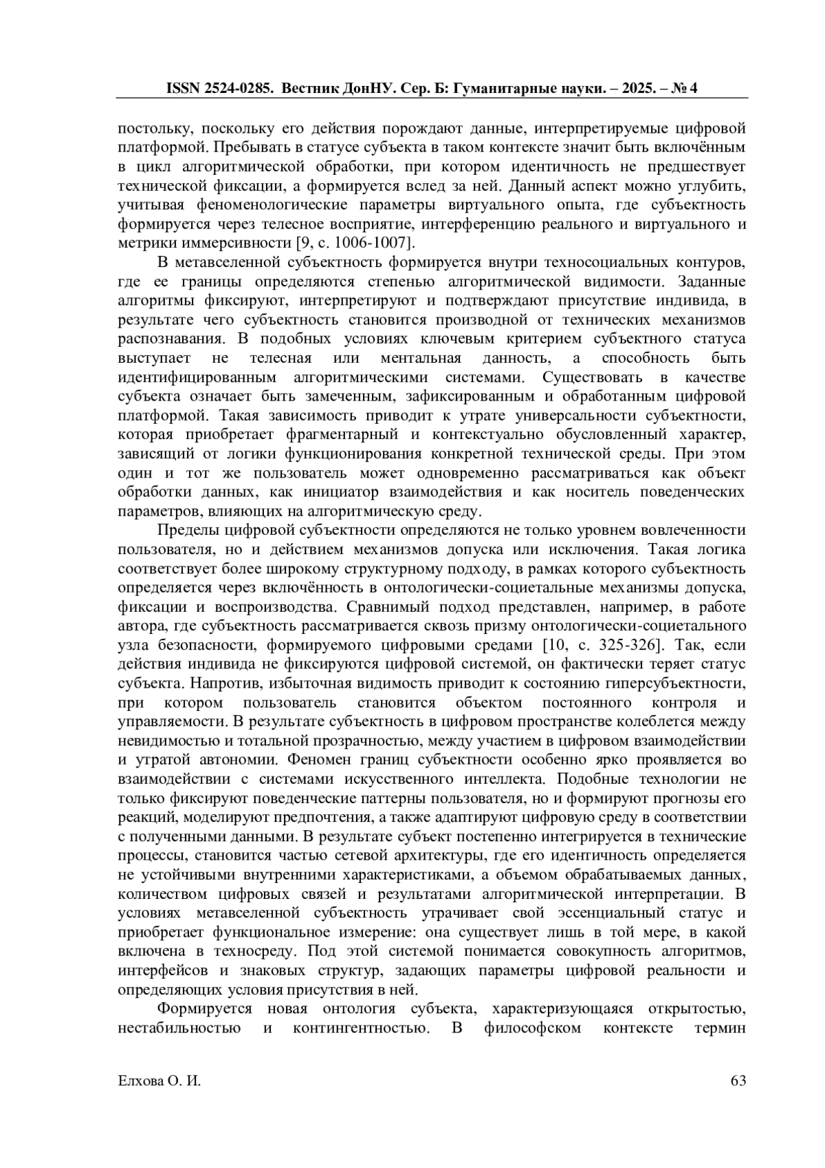 9. Елхова О. И. Метрики феноменологического виртуального опыта // Вестник Российского университета дружбы народов. Серия: Философия. - 2024. - Т. 28. - № 4. - С. 997-1013. -. DOI: 10.22363/2313-2302-2024-28-4-997-1013 EDN: JLFZMM