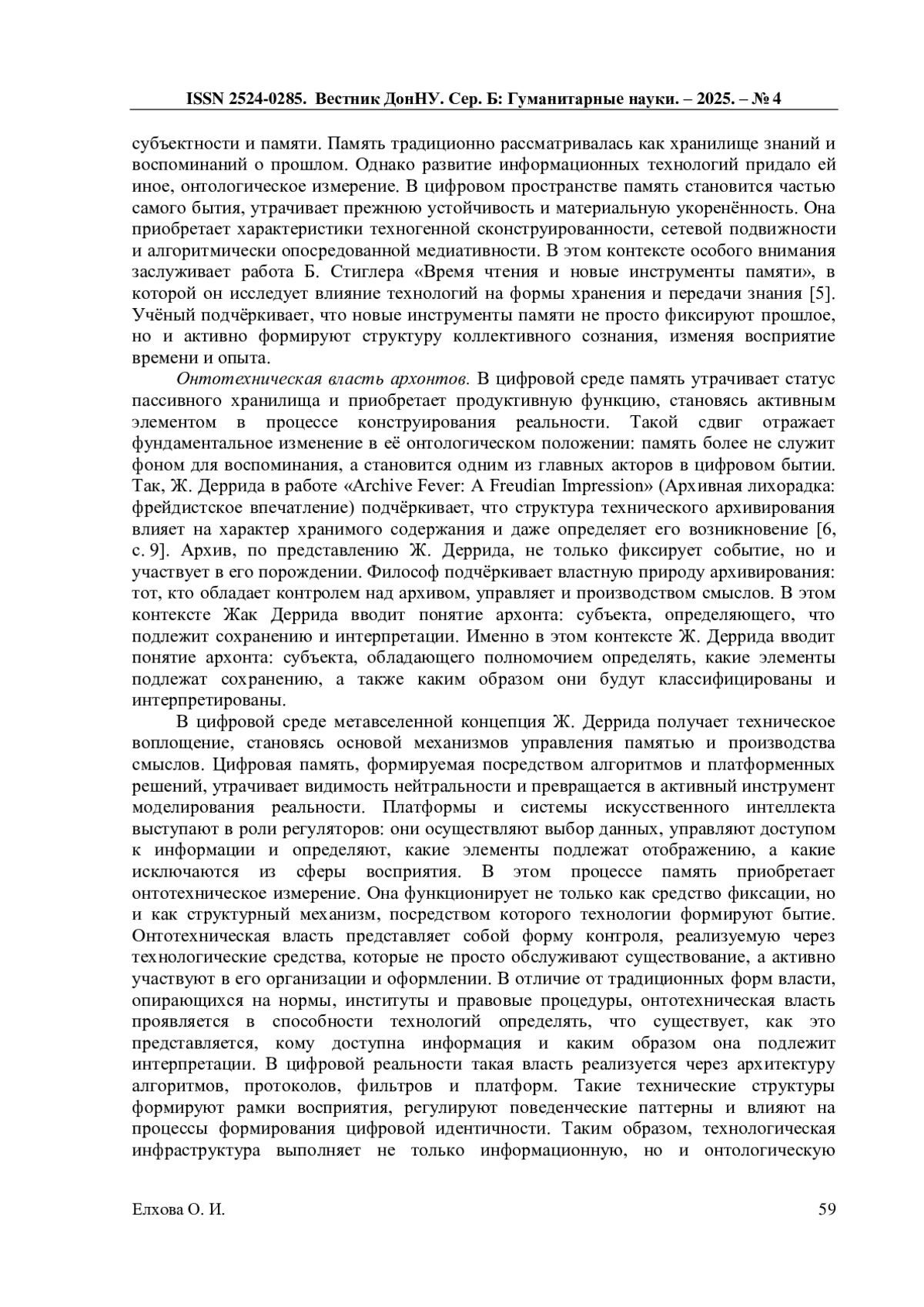 10. Елхова О. И. Онтологически-социетальный узел безопасности как феномен цифровой среды // Вестник Российского университета дружбы народов. Серия:. Философия. - 2025. - Т. 29. - № 2. - С. 317-334. -. DOI: 10.22363/2313-2302-2025-29-2-317-334 EDN: QCHSYV