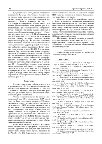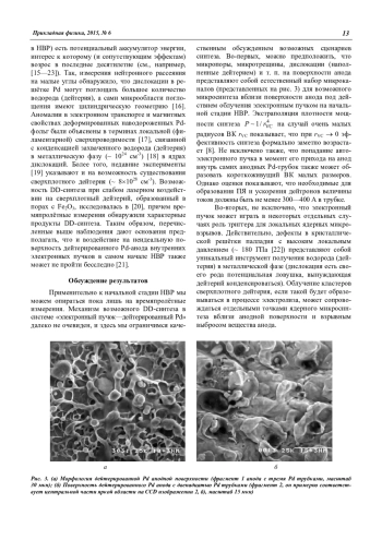 Качественно похожий результат (статистически заметный выход продуктов DD-реакции и большие кратеры) был получен при облучении слаботочным электронным пучком мишеней из Pd/PdO: Dx [24, 25]. Перекрытие обсуждавшихся выше механизмов синтеза на начальной стадии НВР также не исключено и должно быть предметом дальнейшего изучения.