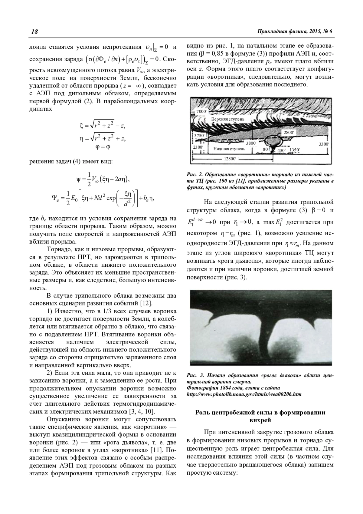 На основе уравнений электрогидродинамики анализируется влияние электрической структуры грозовых облаков и сильных возмущений атмосферного электрического поля под ними на процессы образования торнадо. Показано, что из нижней части вращающегося облака с дипольной структурой может формироваться низовой прорыв, а из облака с трипольной структурой — воронка торнадо.
