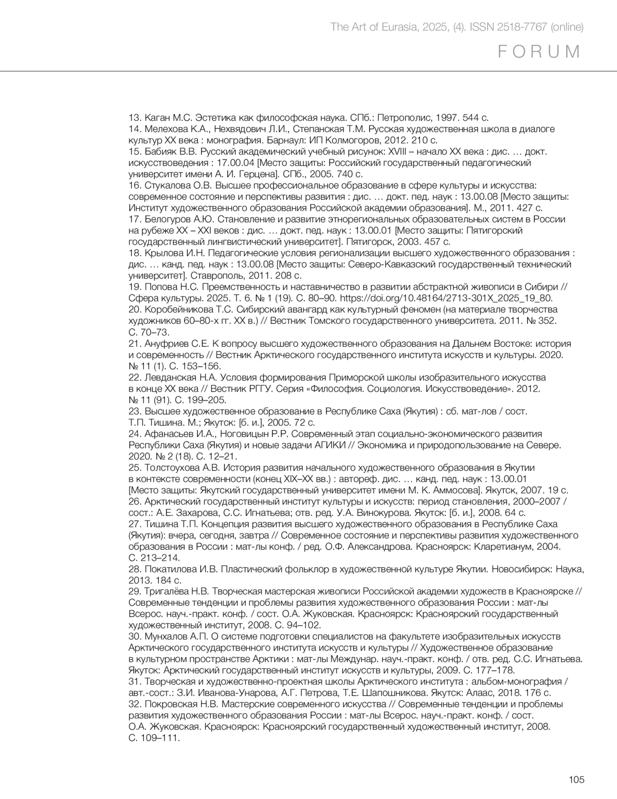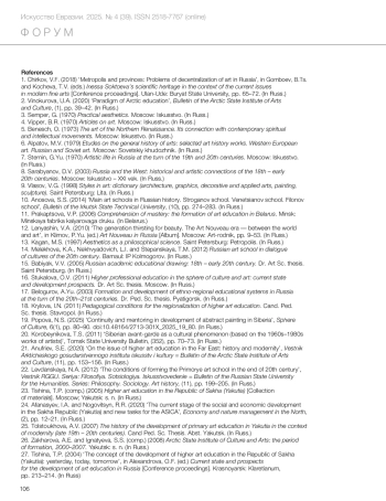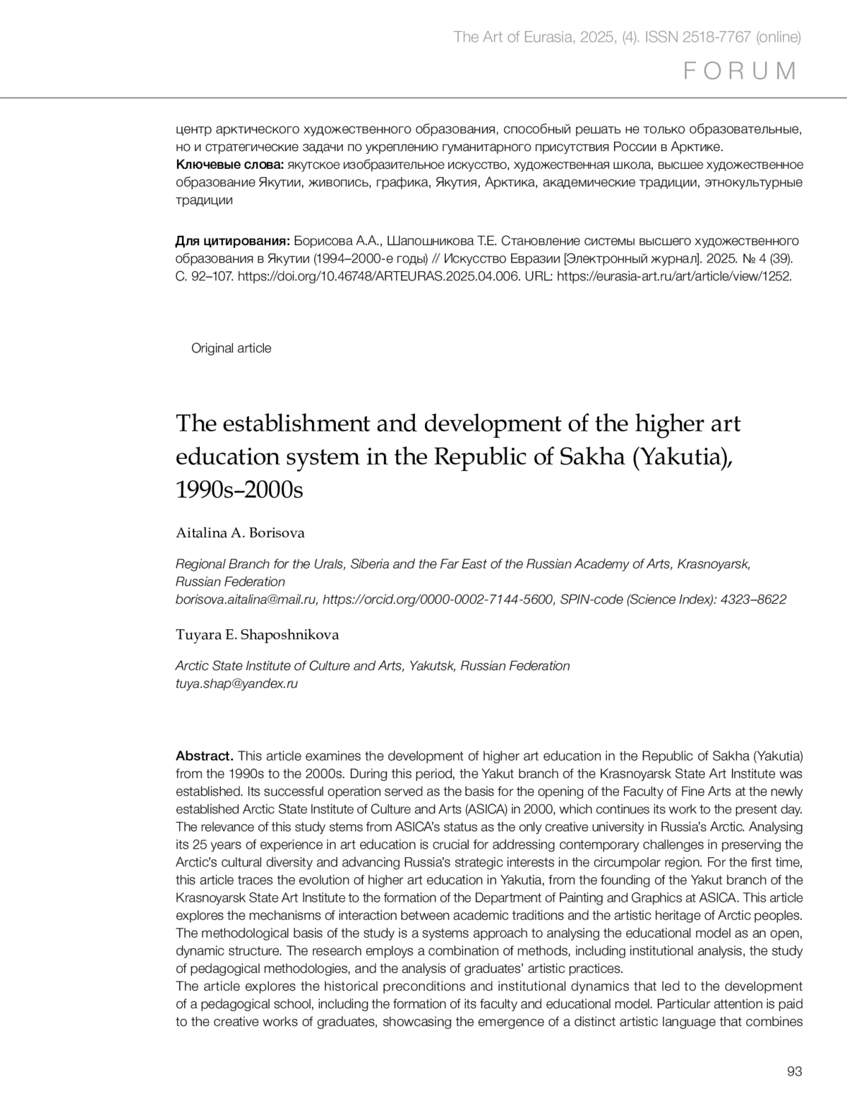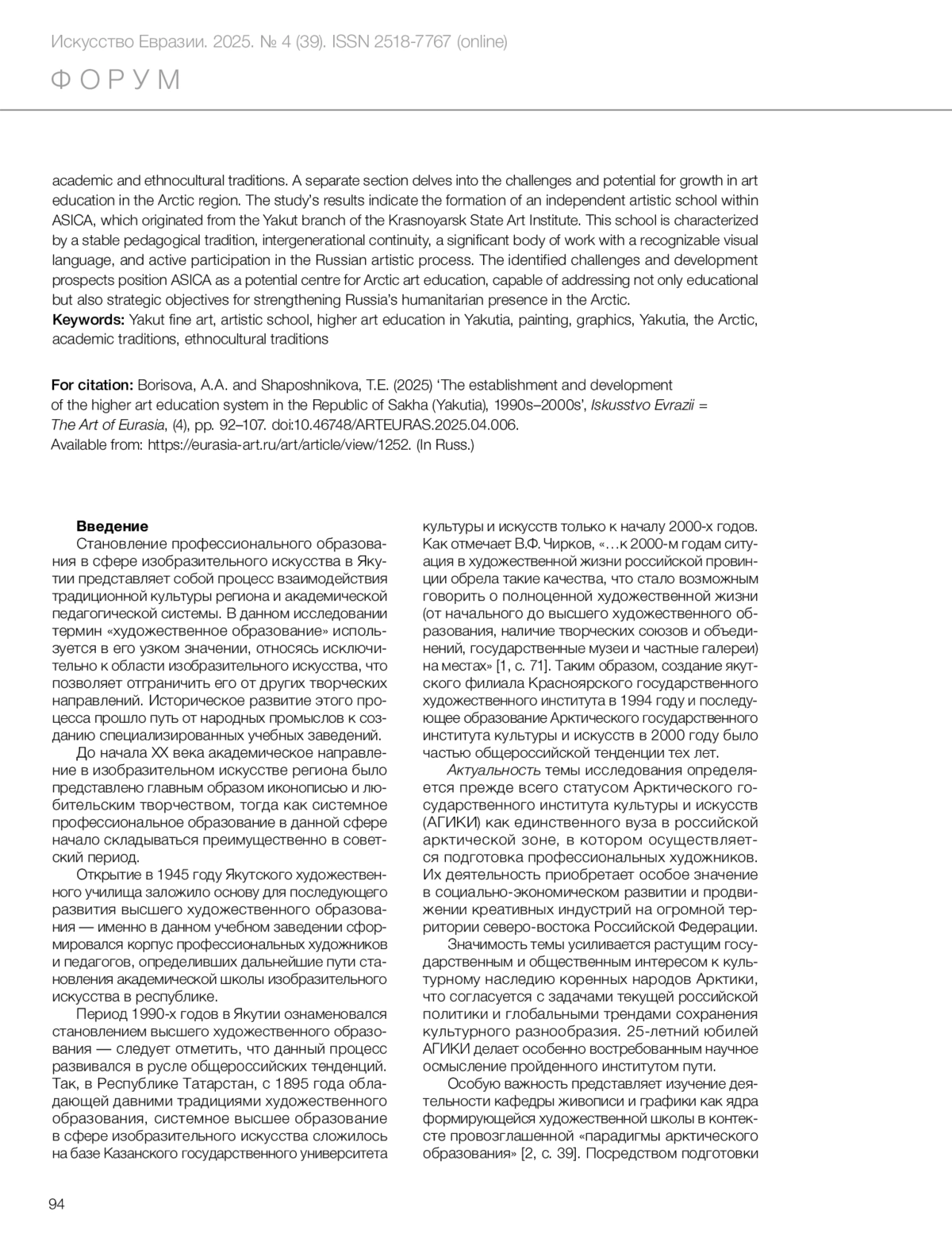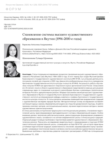 Борисова А.А., Шапошникова Т.Е. Становление системы высшего художественного образования в Якутии (1994–2000-е годы) // Искусство Евразии [Электронный журнал]. 2025. No 4 (39).