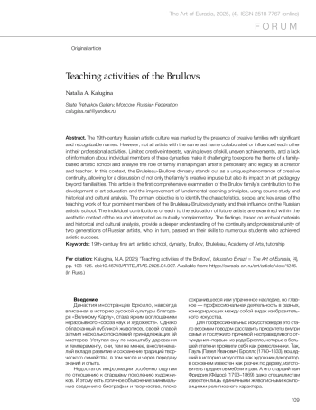The 19th-century Russian artistic culture was marked by the presence of creative families with significant and recognizable names. However, not all artists with the same last name collaborated or influenced each other in their professional activities. Limited creative interests, varying levels of skill, uneven achievements, and a lack of information about individual members of these dynasties make it challenging to explore the theme of a family-based artistic school and analyse the role of family in shaping an artist’s personality and legacy as a creator and teacher. In this context, the Bruleleau-Brullovs dynasty stands out as a unique phenomenon of creative continuity, allowing for a discussion of not only the family’s creative impulse but also its impact on art pedagogy beyond familial ties. This article is the first comprehensive examination of the Brullov family’s contribution to the development of art education and the improvement of fundamental teaching principles, using source study and historical and cultural analysis. The primary objective is to identify the characteristics, scope, and key areas of the teaching work of four prominent members of the Bruleleau-Brullovs dynasty and their influence on the Russian artistic school. The individual contributions of each to the education of future artists are examined within the aesthetic context of the era and interpreted as mutually complementary. The findings, based on archival materials and historical and cultural analysis, provide a deeper understanding of the continuity and professional unity of two generations of Russian artists, who, in turn, passed on their skills to numerous students who achieved artistic success.