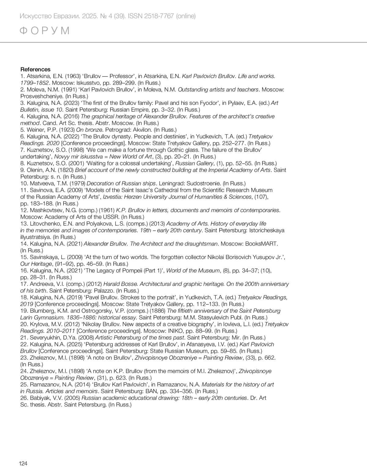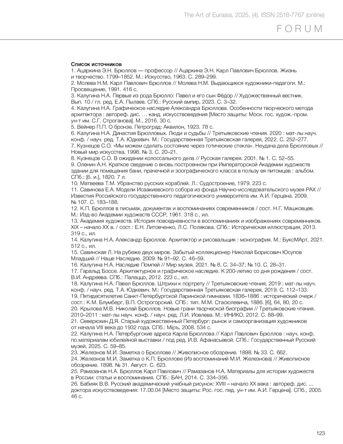 Калугина Н.А. Преподавательская деятельность Брюлловых // Искусство Евразии [Электронный журнал]. 2025. No 4 (39). С. 108–125. https://doi.org/10.46748/ARTEURAS.2025.04.007.