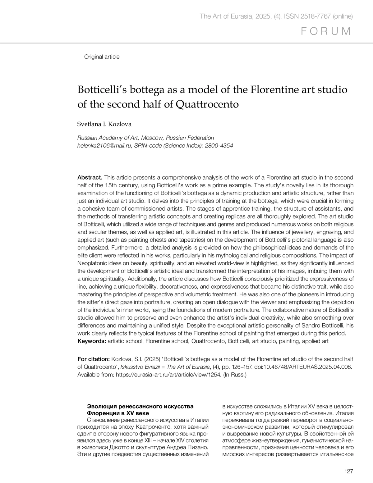 Козлова С.И. Bottega Боттичелли как образец флорентийской мастерской живописи второй половины Кватроченто // Искусство Евразии [Электронный журнал]. 2025. No 4 (39).