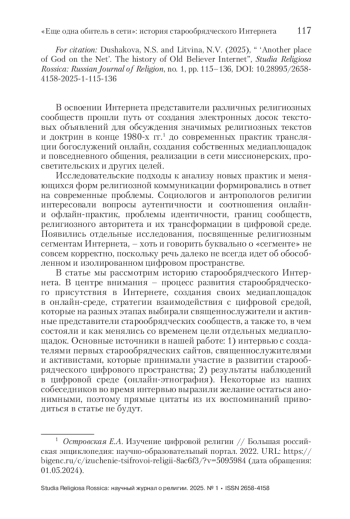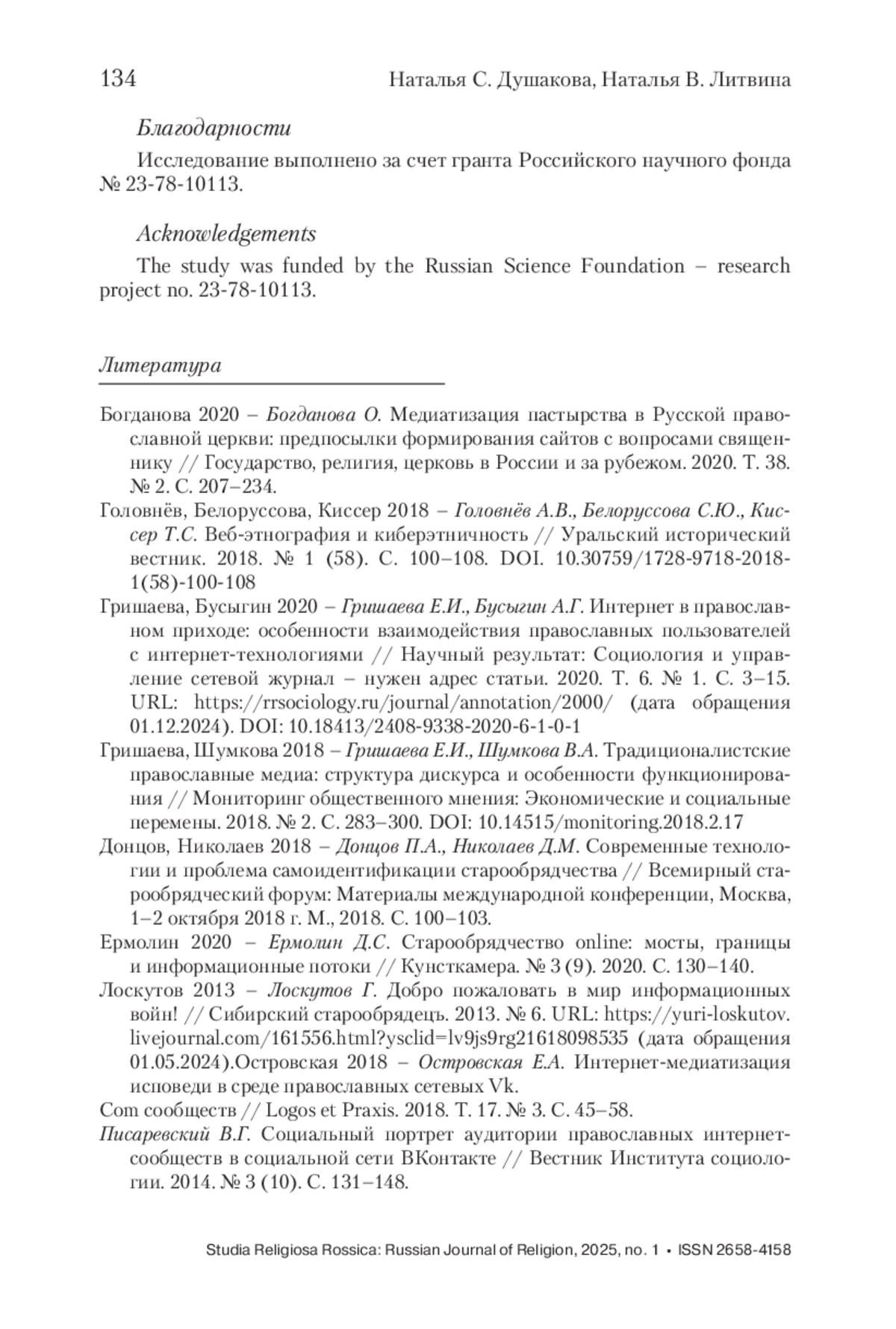 3. Гришаева, Бусыгин 2020 - Гришаева Е.И., Бусыгин А.Г. Интернет в православном приходе: особенности взаимодействия православных пользователей с интернет-технологиями // Научный результат: Социология и управление сетевой журнал - нужен адрес статьи. 2020. Т. 6. № 1. С. 3-15. URL: https://rrsociology.ru/journal/annotation/2000 (дата обращения 01.12.2024). https://doi.org/10.18413/2408-9338-2020-6-1-0-1
