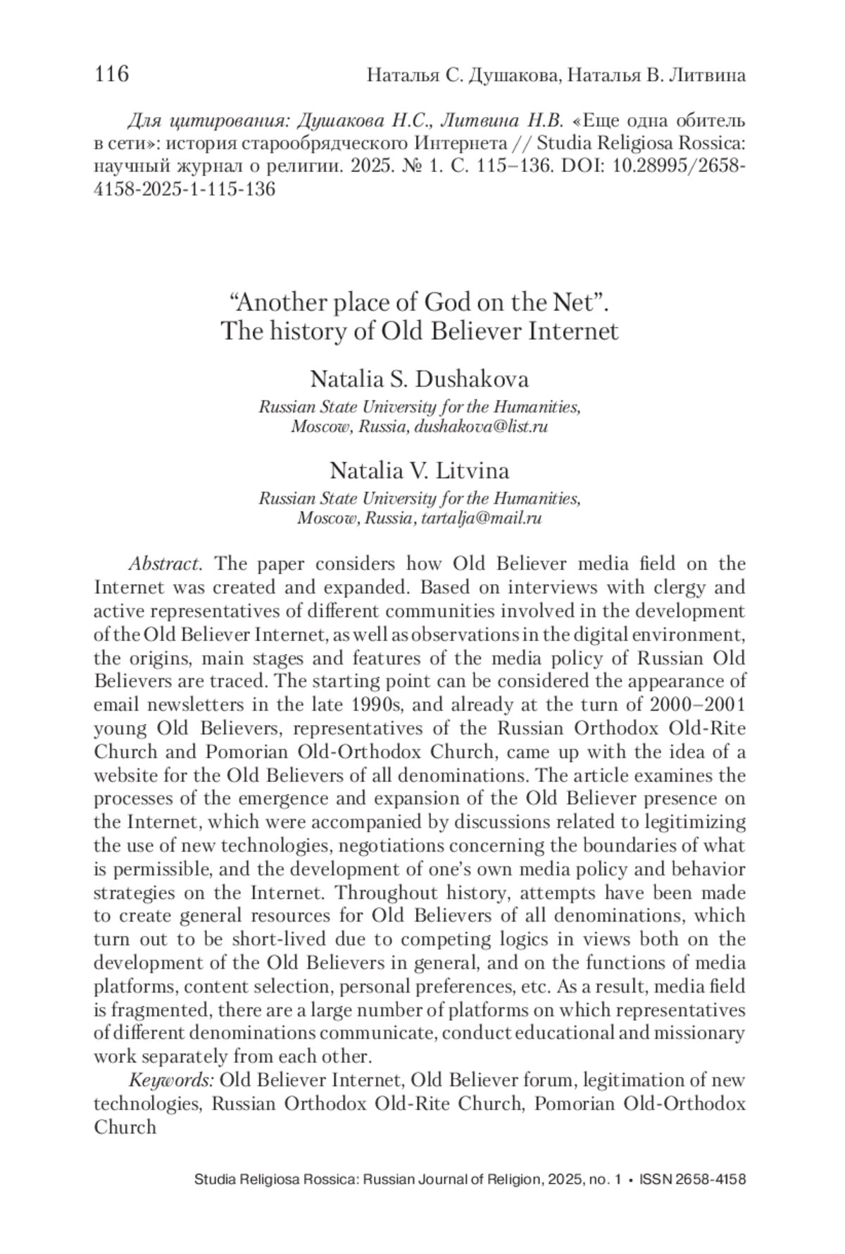 6. Ермолин 2020 - Ермолин Д.С. Старообрядчество online: мосты, границы и информационные потоки // Кунсткамера. № 3 (9). 2020. С. 130-140.