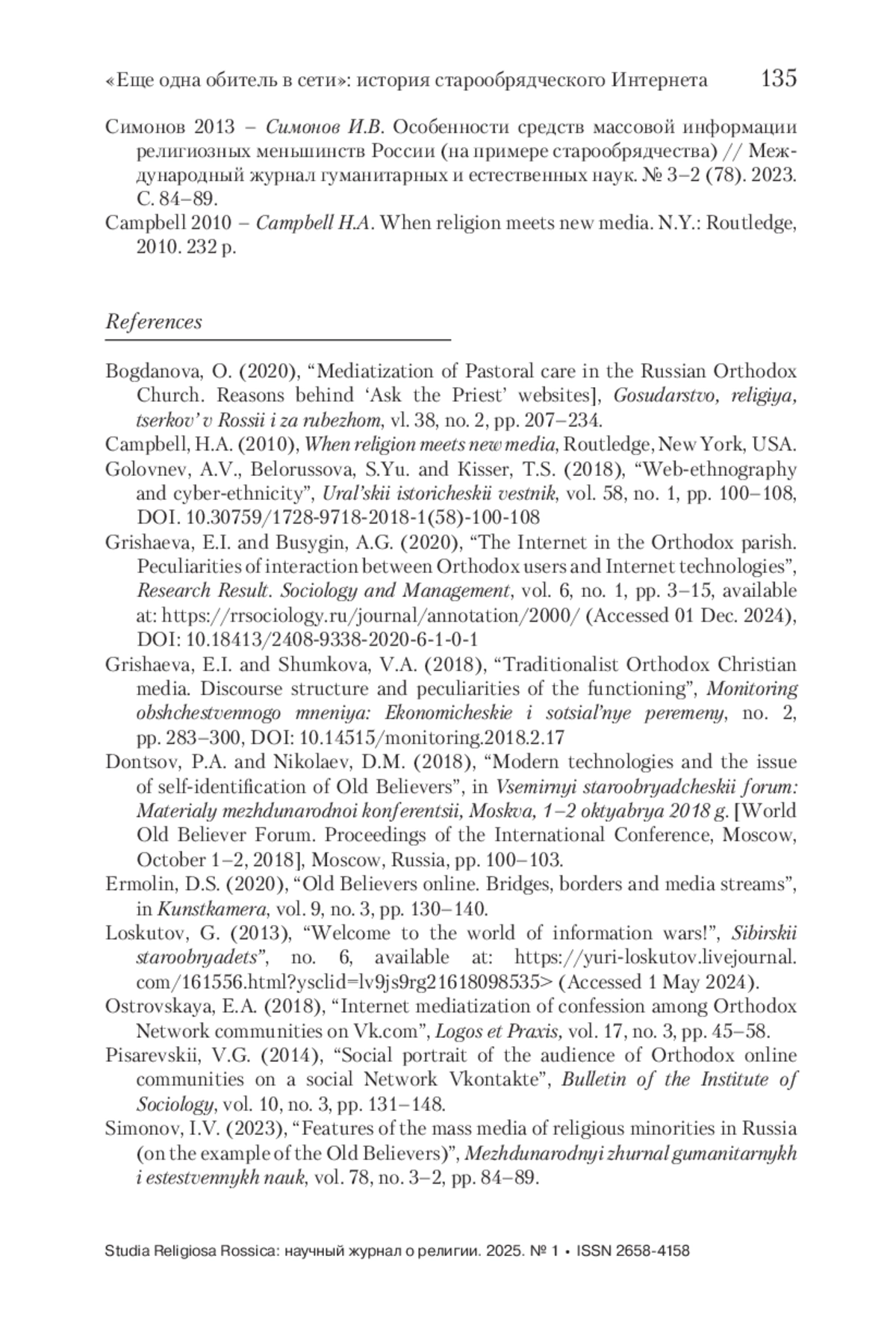 10. Симонов 2013 - Симонов И.В. Особенности средств массовой информации религиозных меньшинств России (на примере старообрядчества) // Международный журнал гуманитарных и естественных наук. № 3-2 (78). 2023. С. 84-89.