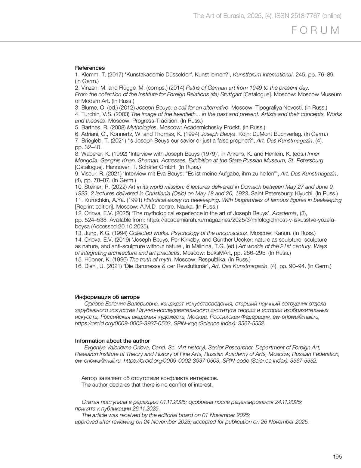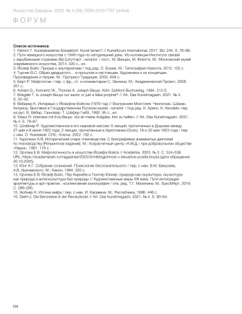 12. Orlova, E.V. (2025) ‘The mythological experience in the art of Joseph Beuys’, Academia, (3), pp. 524–538. Available from: https://academiarah.ru/magazines/2025/3/mifologichnost-v-iskusstve-yozefa-boysa (Accessed 20.10.2025).