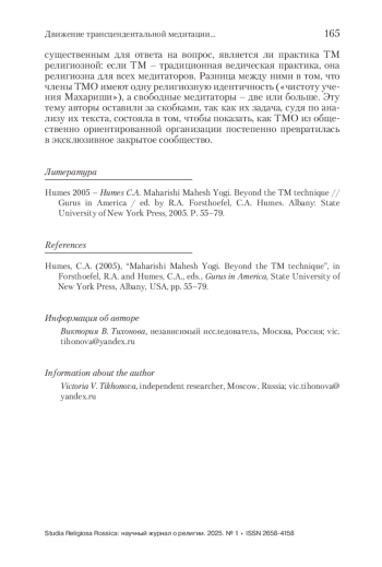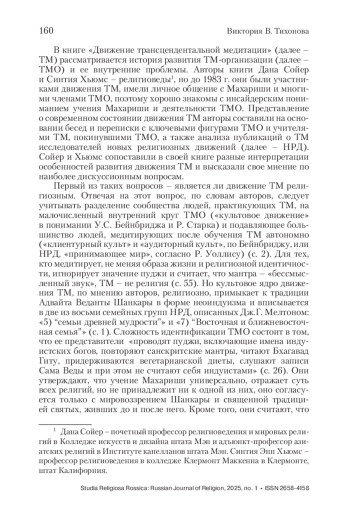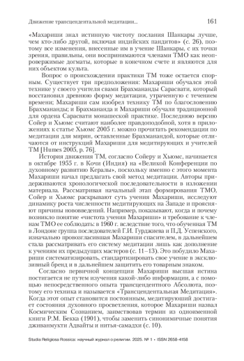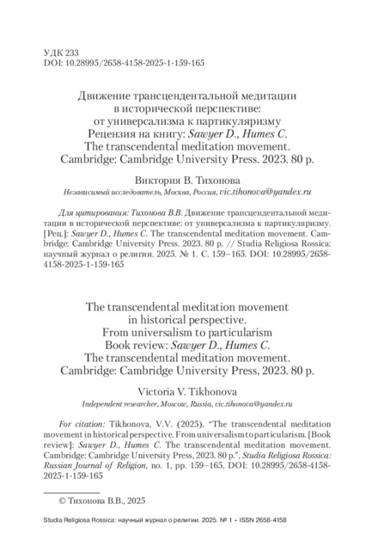 Тихонова В. В. Движение трансцендентальной медитации в исторической перспективе: от универсализма к партикуляризму Рецензия на книгу: Sawyer D., Humes C. The transcendental meditation movement. Cambridge: Cambridge University Press. 2023. 80 р. Studia Religiosa Rossica: научный журнал о религии. 2025;(1):159-165. https://doi. org/10.28995/2658-4158-2025-1-159-165