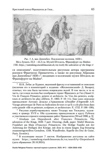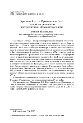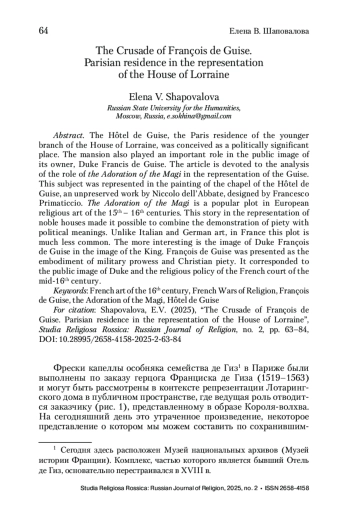 Отель де Гиз, парижская резиденция младшей ветви Лотарингского дома, задумывался как политически значимое место. Важную роль играл особняк и в публичном образе его владельца, герцога Франциска де Гиза. Статья посвящена анализу роли сюжета «Поклонение волхвов» в репрезентации Гизов, представленного в росписи капеллы Отеля де Гиз – несохранившейся работы Никколо дель Аббате, выполненной по проекту Франческо Приматиччо. «Поклонение волхвов» – популярный сюжет в европейском религиозном искусстве XV–XVI вв. Его использование в репрезентации знатных домов позволяло совмещать демонстрацию благочестия с политическими смыслами. В отличие от итальянского и немецкого искусства, во Франции данный сюжет встречается заметно реже. Тем интереснее изображение герцога Франциска де Гиза в образе Короля-волхва. Франциск де Гиз был представлен как воплощение военной доблести и христианского благочестия, что соответствовало его публичному образу и религиозной политике французского двора середины XVI в.