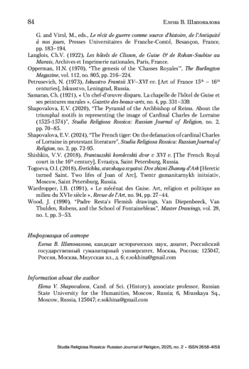 15. Шаповалова 2020 - Шаповалова Е.В. Пирамида архиепископа Реймского: о триумфальных мотивах в репрезентации образа кардинала Карла Лотарингского (1525-1574) // Studia Religiosa Rossica: научный журнал о религии. 2020. № 2. С. 70-85.