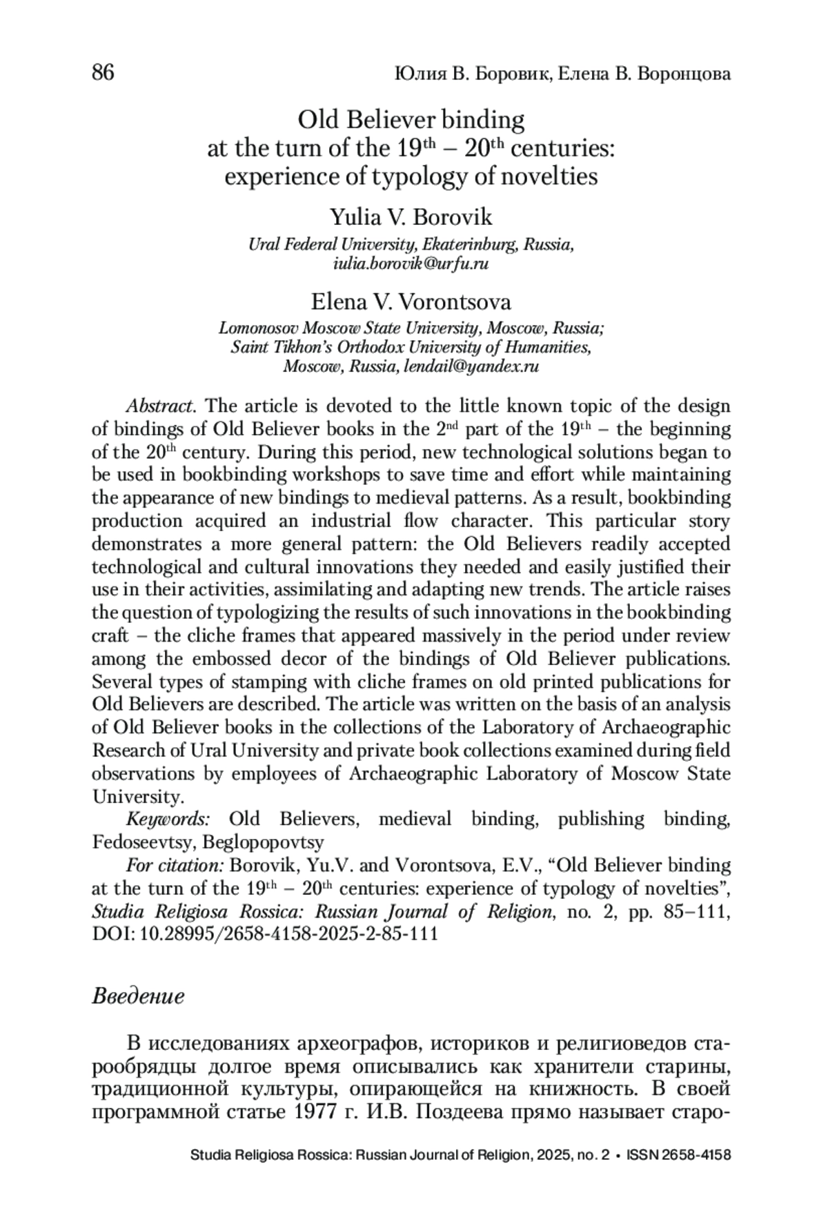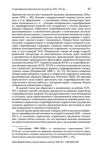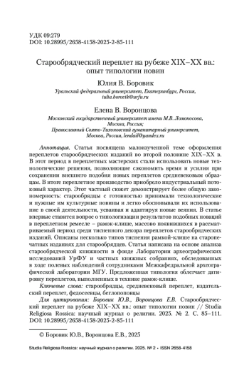 Статья посвящена малоизученной теме оформления переплетов старообрядческих изданий во второй половине XIX–XX в. В этот период в переплетных мастерских стали использовать новые технологические решения, позволяющие сэкономить время и усилия при сохранении внешнего подобия новых переплетов средневековым образцам. В итоге переплетное производство приобрело индустриальный потоковый характер. Этот частный сюжет демонстрирует более общую закономерность: старообрядцы с готовностью принимали технологические и нужные им культурные новины и легко обосновывали их использование в своей деятельности, усваивая и адаптируя новые веяния. В статье впервые ставится вопрос о типологизации результатов подобных новаций в переплетном ремесле – рамок-клише, массово появившихся в рассматриваемый период среди тисненного декора переплетов старообрядческих изданий. Описаны несколько типов тиснения рамкой-клише на старопечатных изданиях для старообрядцев. Статья написана на основе анализа старообрядческой книжности в фонде Лаборатории археографических исследований УрФУ и частных книжных собраниях, обследованных в ходе полевых наблюдений сотрудниками Межкафедральной археографической лаборатории МГУ. Предложенная типология облегчает датировку переплетов, выполненных в технике рамок-клише.