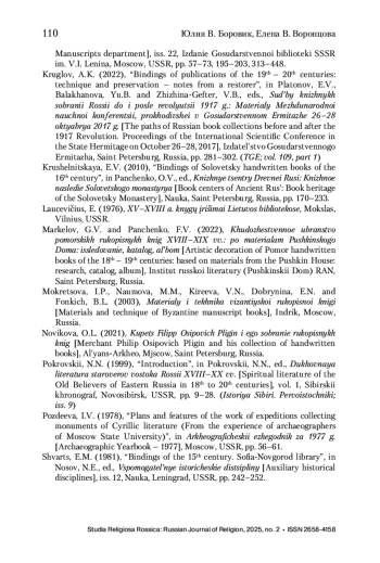 5. Крушельницкая 2010 - Крушельницкая Е.В. Переплеты соловецких рукописных книг XVI в. // Книжные центры Древней Руси. Книжное наследие Соловецкого монастыря / отв. ред. О.В. Панченко. СПб.: Наука, 2010. С. 170-233.
