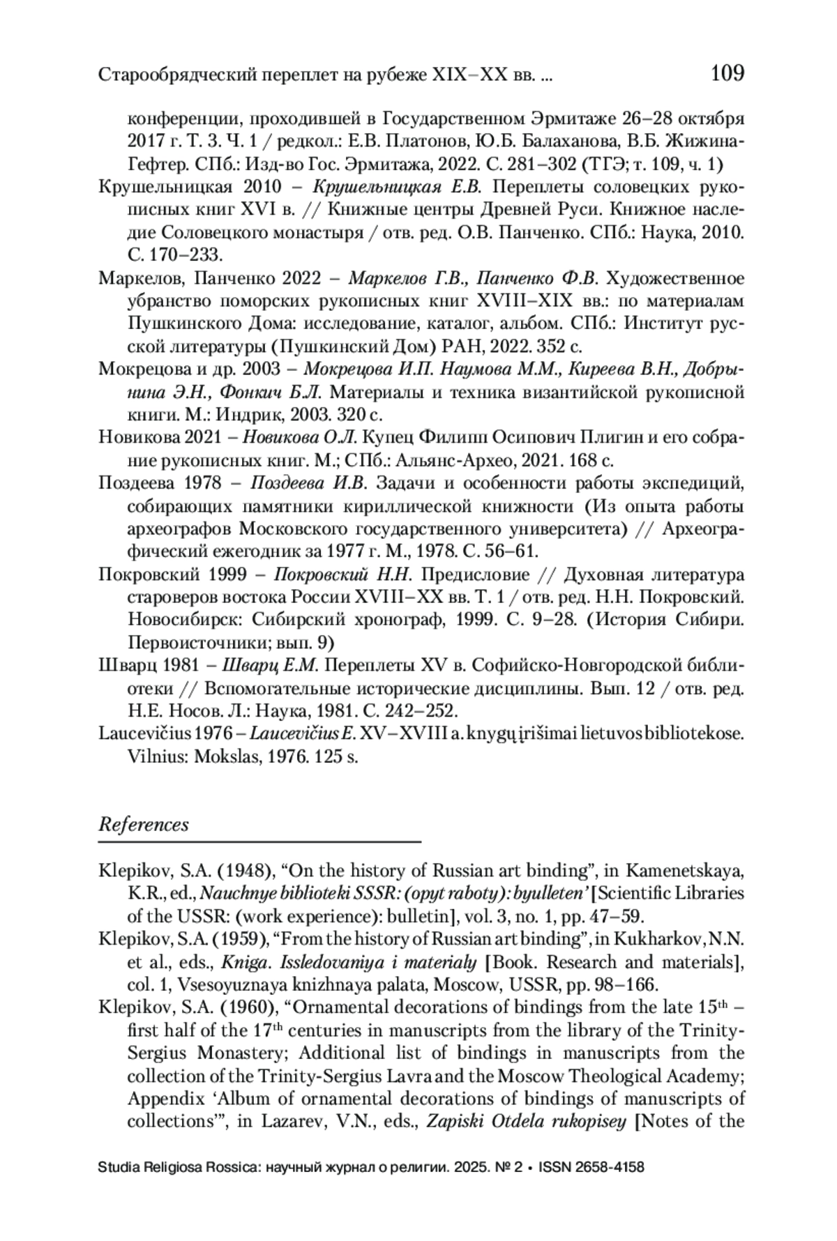 2. Клепиков 1959 - Клепиков С.А. Из истории русского художественного переплета // Книга: Исследования и материалы. Сб. 1 / Редкол.: Н.Н. Кухарков и др. М.: Всесоюзная книжная палата, 1959. С. 98-166.