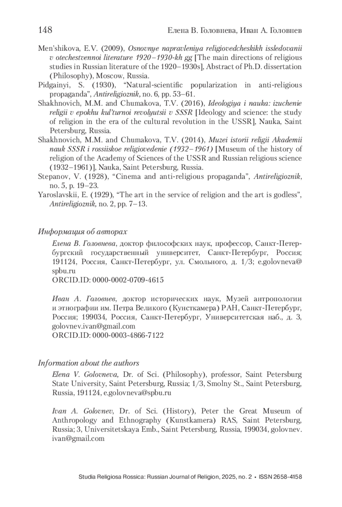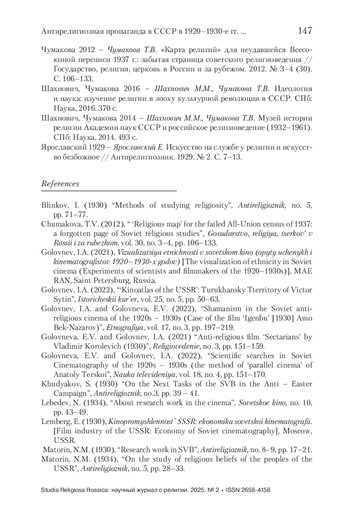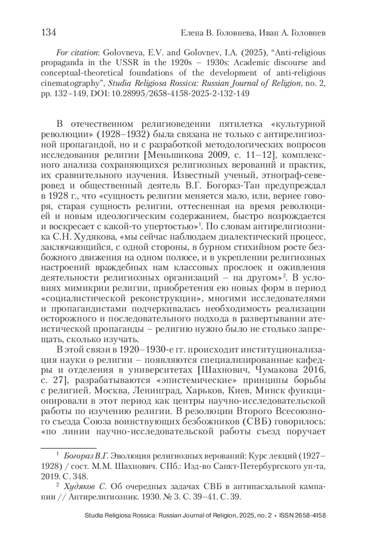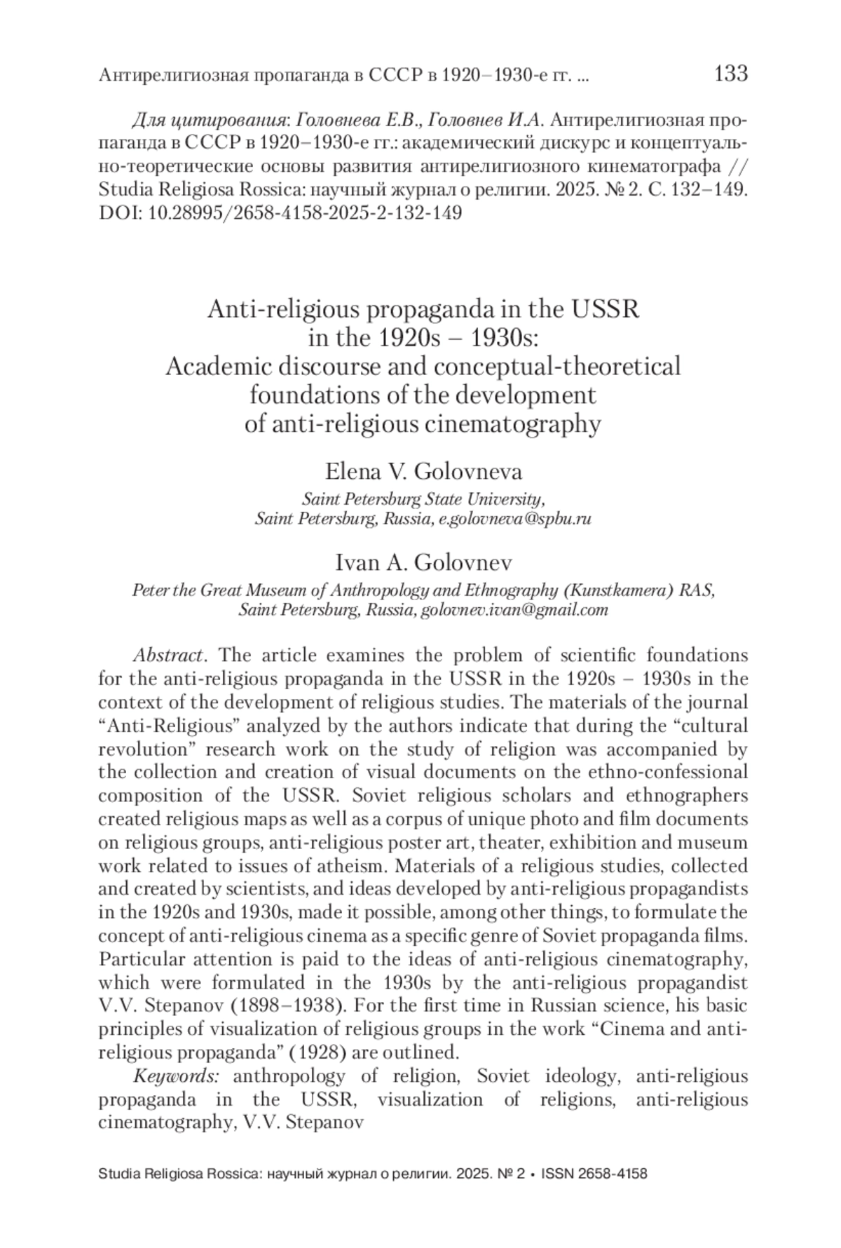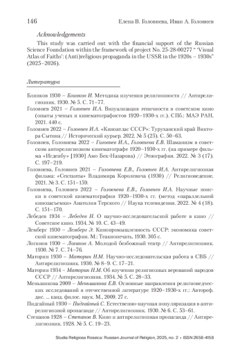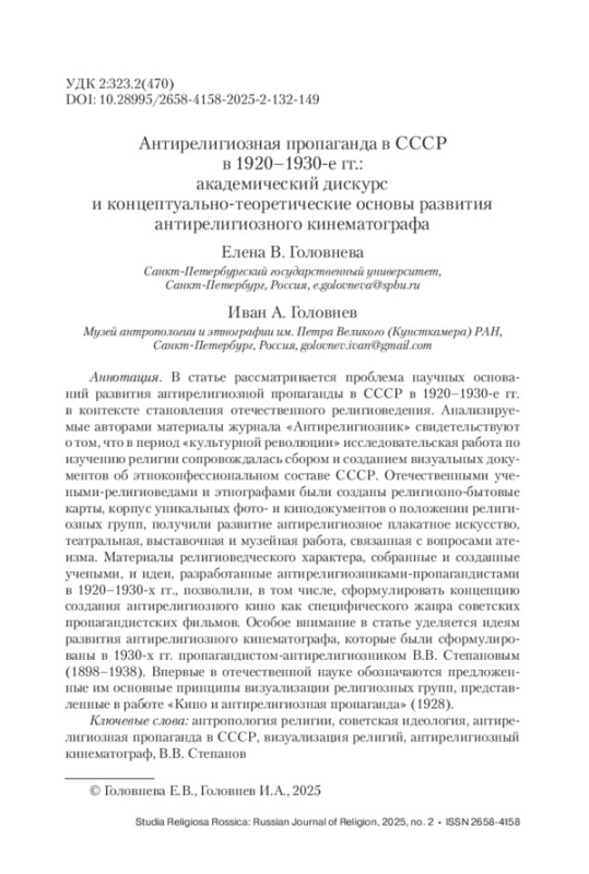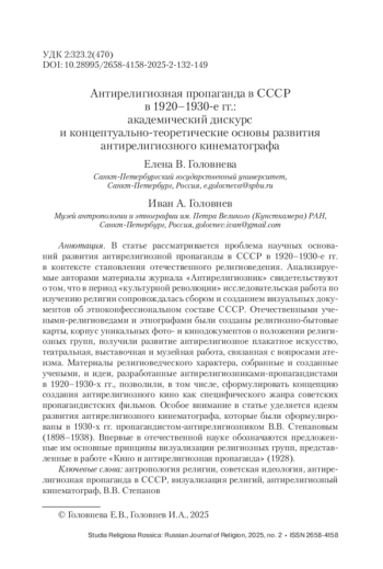 В статье рассматривается проблема научных оснований развития антирелигиозной пропаганды в СССР в 1920–1930-е гг. в контексте становления отечественного религиоведения. Анализируемые авторами материалы журнала «Антирелигиозник» свидетельствуют о том, что в период «культурной революции» исследовательская работа по изучению религии сопровождалась сбором и созданием визуальных документов об этноконфессиональном составе СССР. Отечественными учеными-религиоведами и этнографами были созданы религиозно-бытовые карты, корпус уникальных фото- и кинодокументов о положении религиозных групп, получили развитие антирелигиозное плакатное искусство, театральная, выставочная и музейная работа, связанная с вопросами атеизма. Материалы религиоведческого характера, собранные и созданные учеными, и идеи, разработанные антирелигиозниками-пропагандистами в 1920–1930-х гг., позволили, в том числе, сформулировать концепцию создания антирелигиозного кино как специфического жанра советских пропагандистских фильмов. Особое внимание в статье уделяется идеям развития антирелигиозного кинематографа, которые были сформулированы в 1930-х гг. пропагандистом-антирелигиозником В. В. Степановым (1898–1938). Впервые в отечественной науке обозначаются предложенные им основные принципы визуализации религиозных групп, представленные в работе «Кино и антирелигиозная пропаганда» (1928).