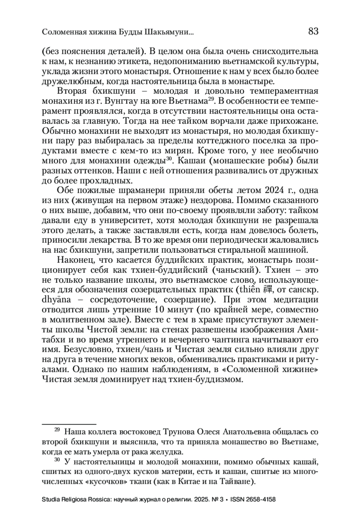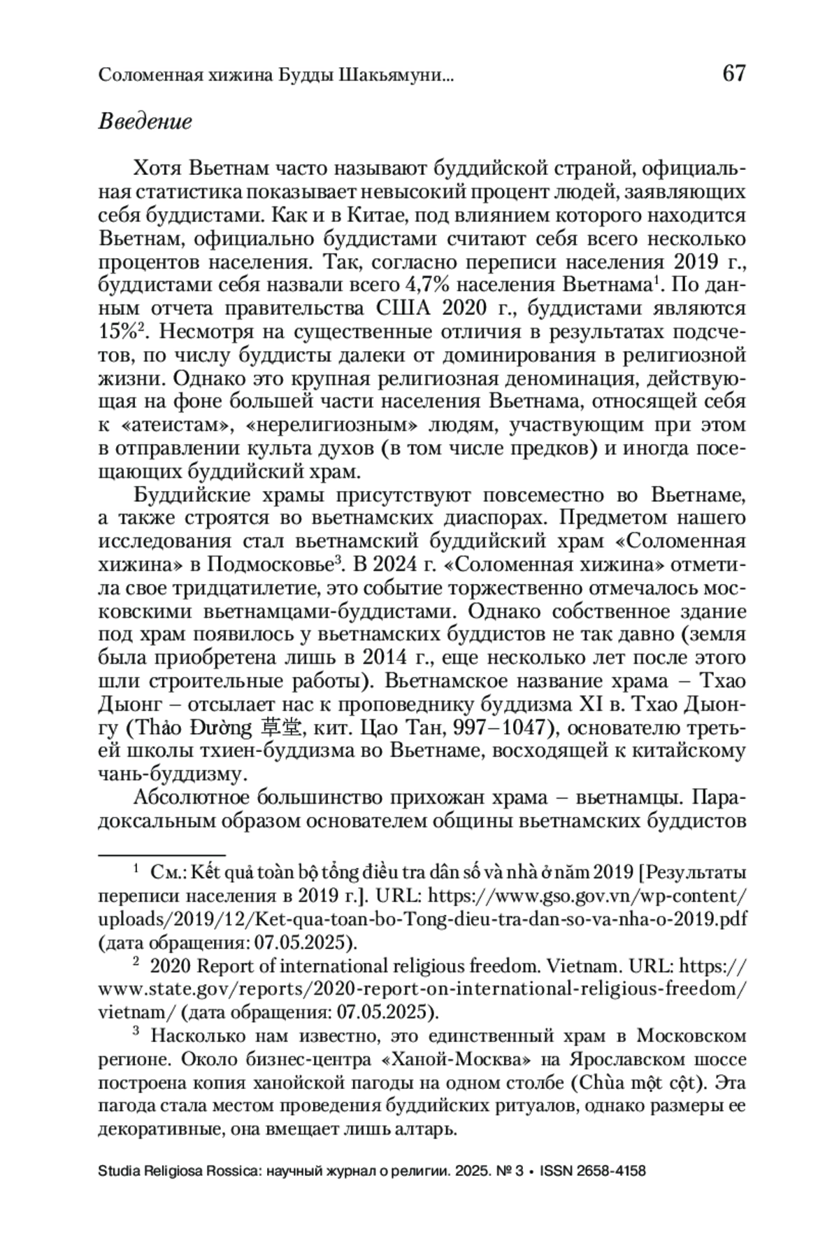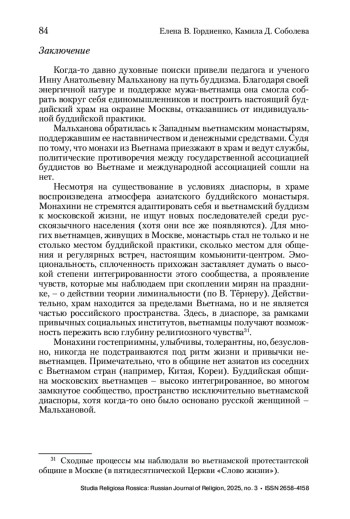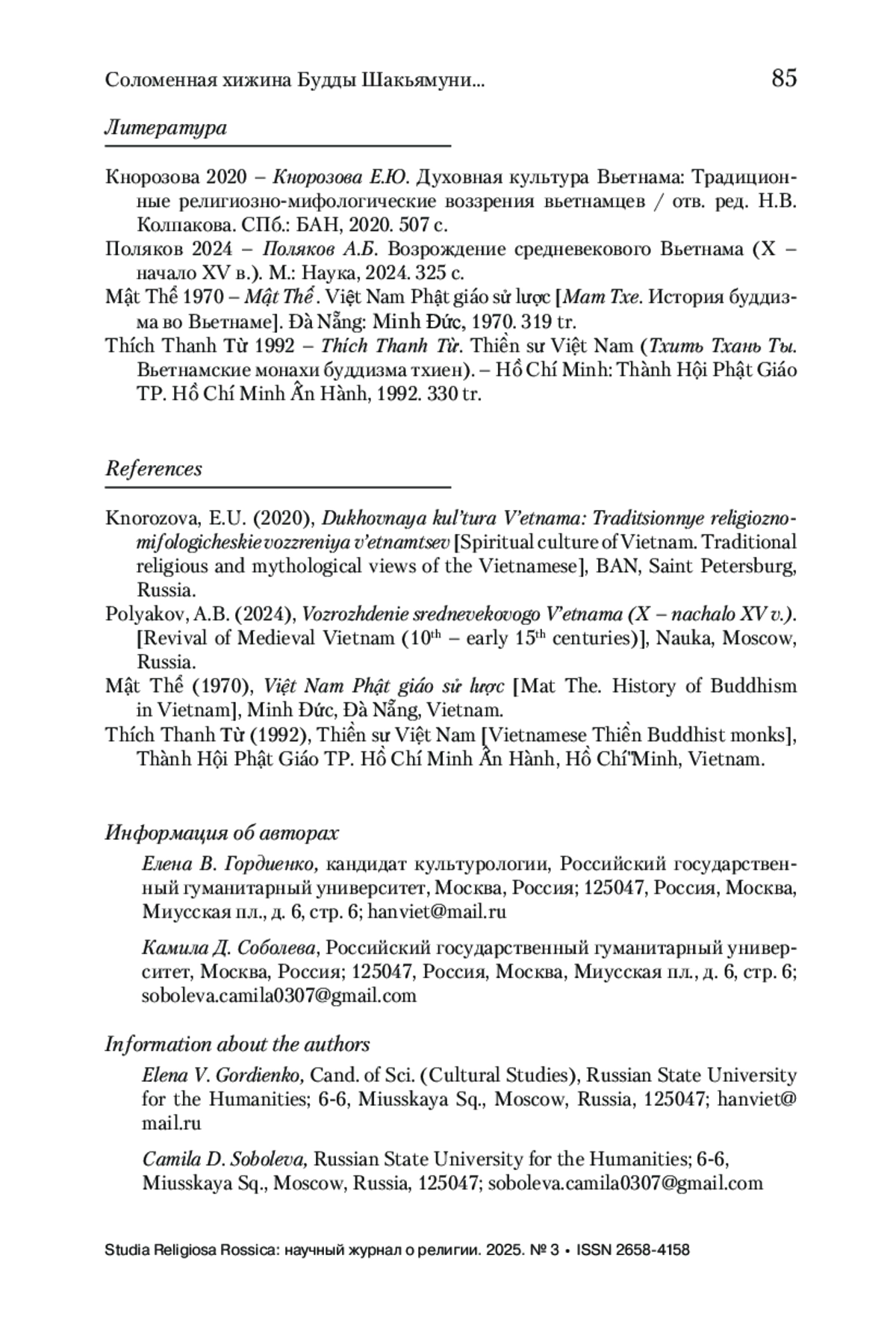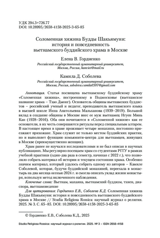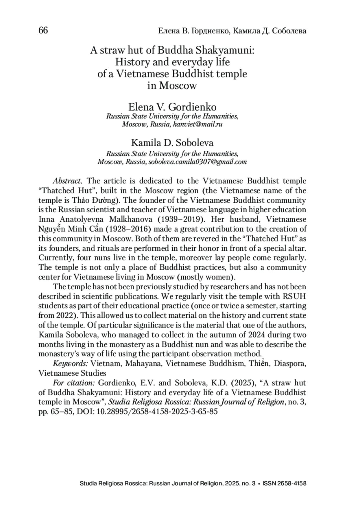 Статья посвящена вьетнамскому буддийскому храму «Соломенная хижина», построенному в Подмосковье (вьетнамское название храма – Тхао Дыонг). Основатель общины вьетнамских буддистов – российский ученый и педагог, преподаватель вьетнамского языка в высшей школе Инна Анатольевна Мальханова (1939–2019). Большой вклад в создание общины в Москве внес ее муж вьетнамец Нгуен Минь Кан (1928–2016). Оба они почитаются в «Соломенной хижине» как ее основатели, в их честь совершаются ритуалы перед специальным алтарем. В настоящее время в храме проживает четыре монахини, постоянно приезжают прихожане. Храм служит не только местом буддийских практик, но и выполняет функцию комьюнити-центра для вьетнамцев, живущих в Москве (преимущественно женщин).