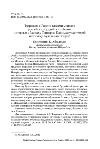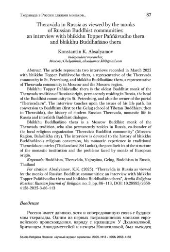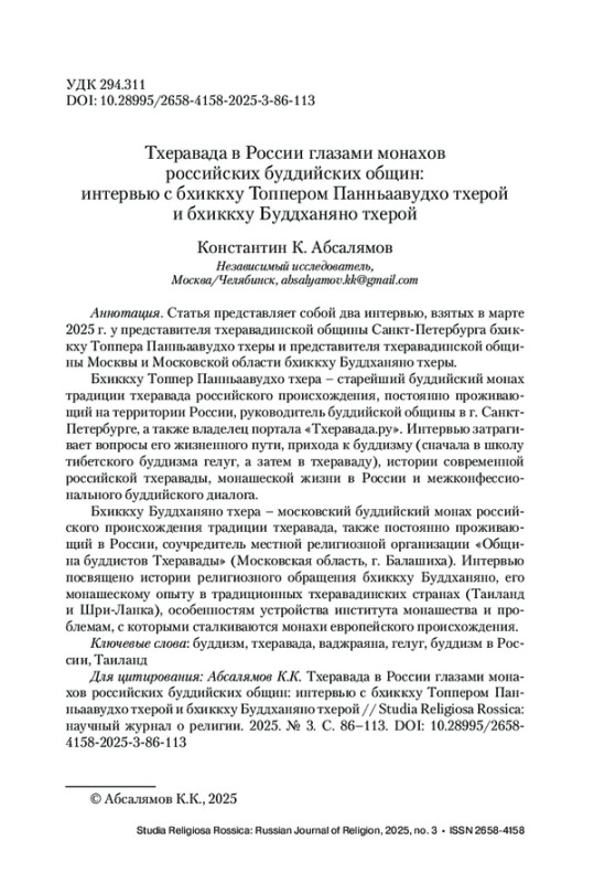 Статья представляет собой два интервью, взятых в марте 2025 г. у представителя тхеравадинской общины Санкт-Петербурга бхиккху Топпера Панньаавудхо тхеры и представителя тхеравадинской общины Москвы и Московской области бхиккху Буддханяно тхеры.