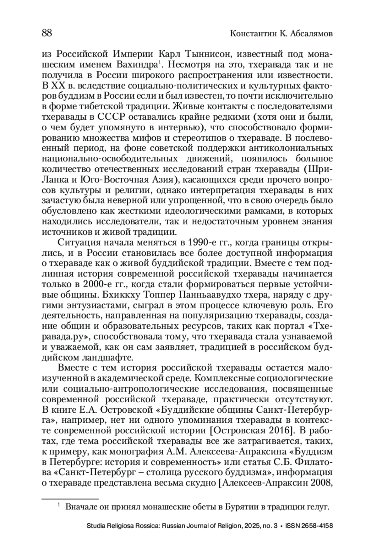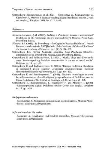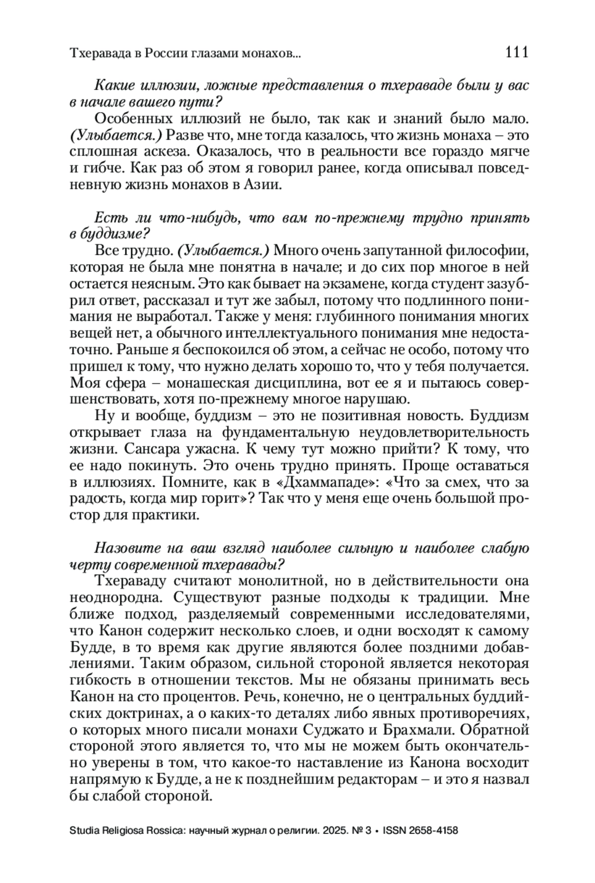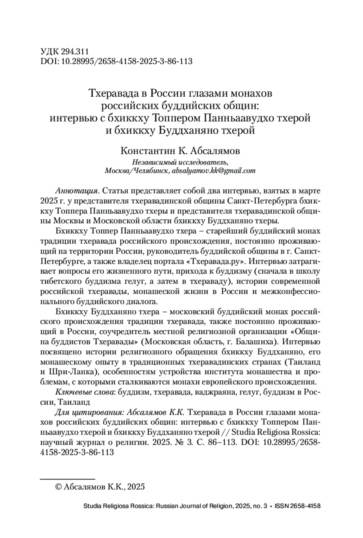 Бхиккху Буддханяно тхера – московский буддийский монах российского происхождения традиции тхеравада, также постоянно проживающий в России, соучредитель местной религиозной организации «Община буддистов Тхеравады» (Московская область, г. Балашиха). Интервью посвящено истории религиозного обращения бхиккху Буддханяно, его монашескому опыту в традиционных тхеравадинских странах (Таиланд и Шри-Ланка), особенностям устройства института монашества и проблемам, с которыми сталкиваются монахи европейского происхождения.